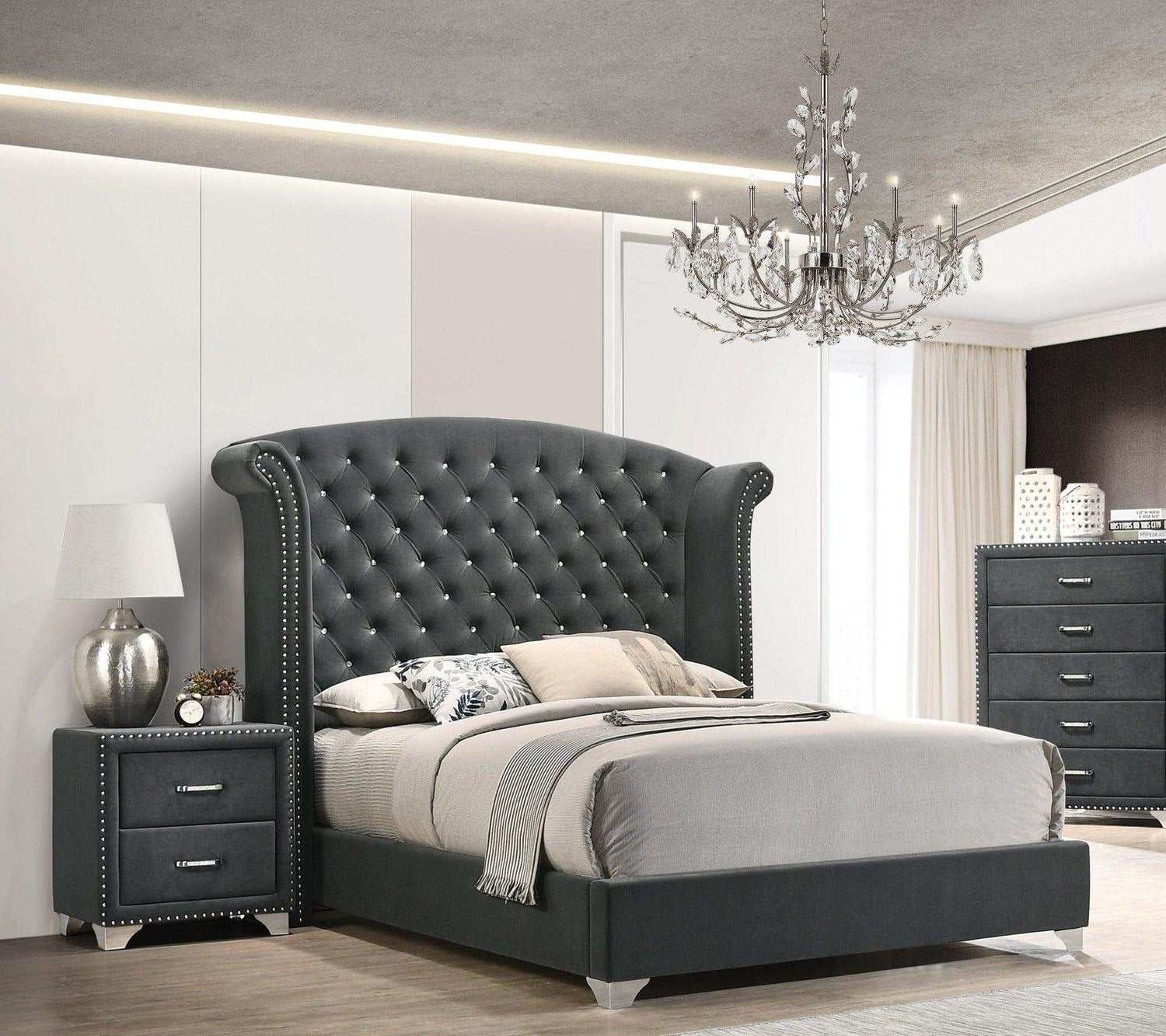 Every morning you'll wake up like you're living in a castle with this exquisite traditional style upholstered bed. An elegantly dramatic wingback style headboard makes a stunning focal point in your sleeping space. Adorned with nail head trim and button tufting, the velvet is luxuriously soft to the touch. This bed is supported on a low profile with sleek silver chrome legs. Regal and plush, this piece is the epitome of style and function.