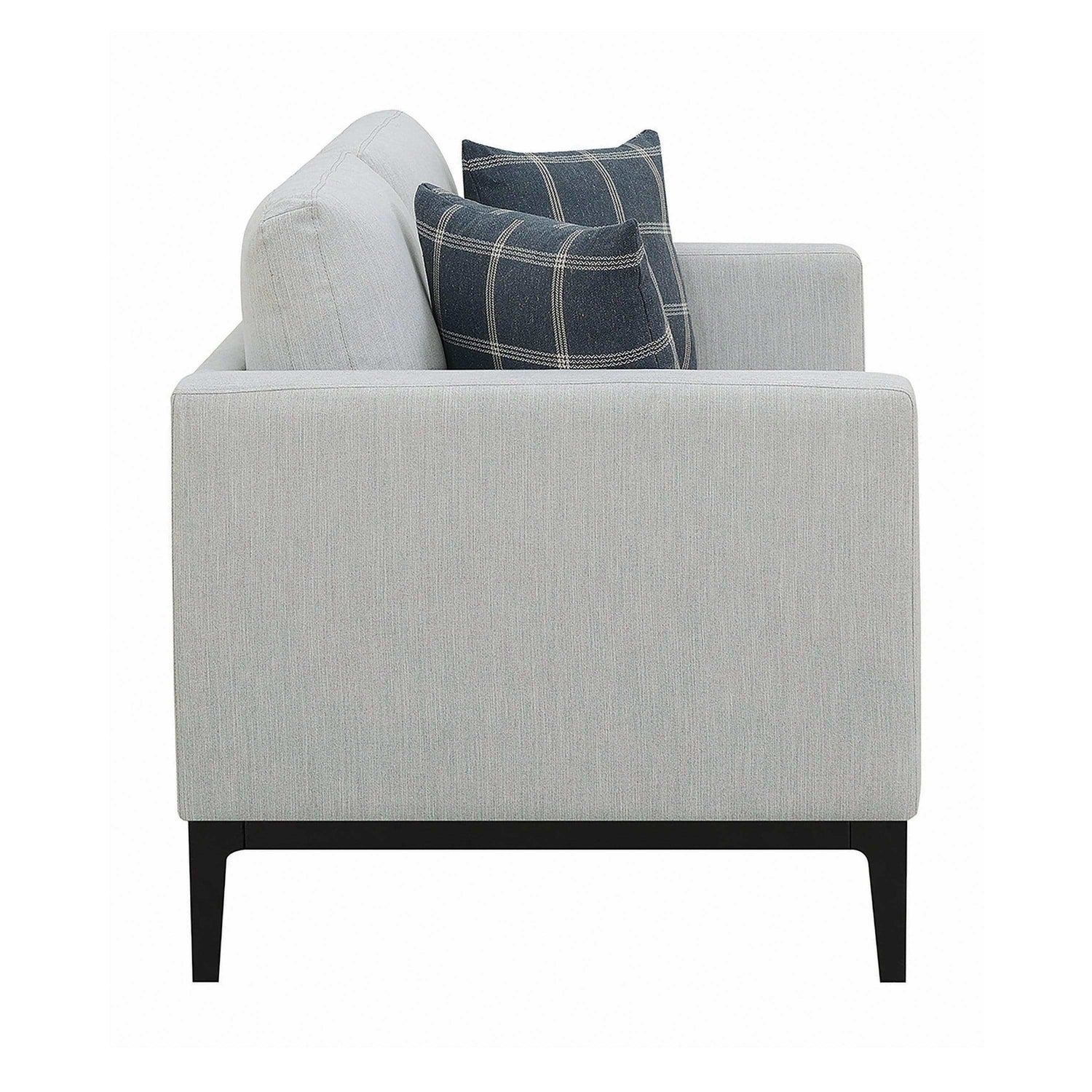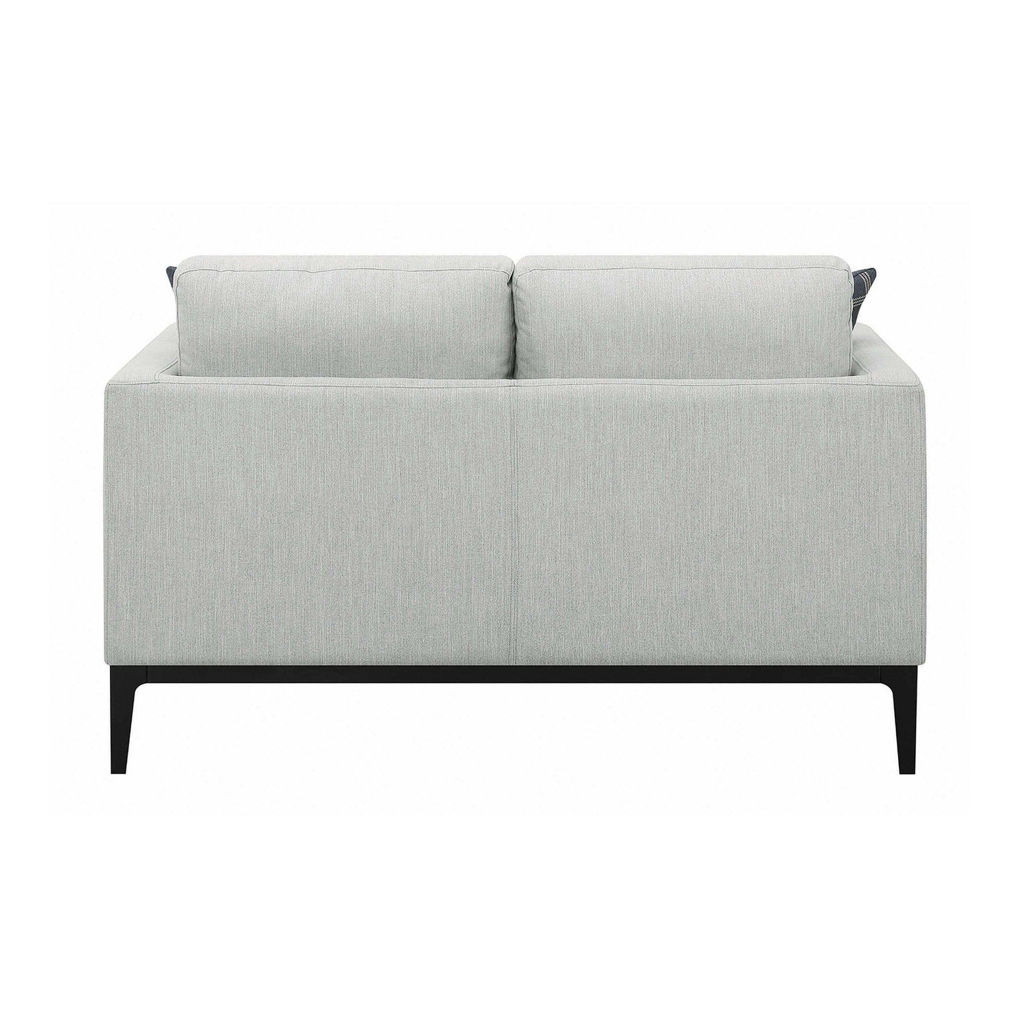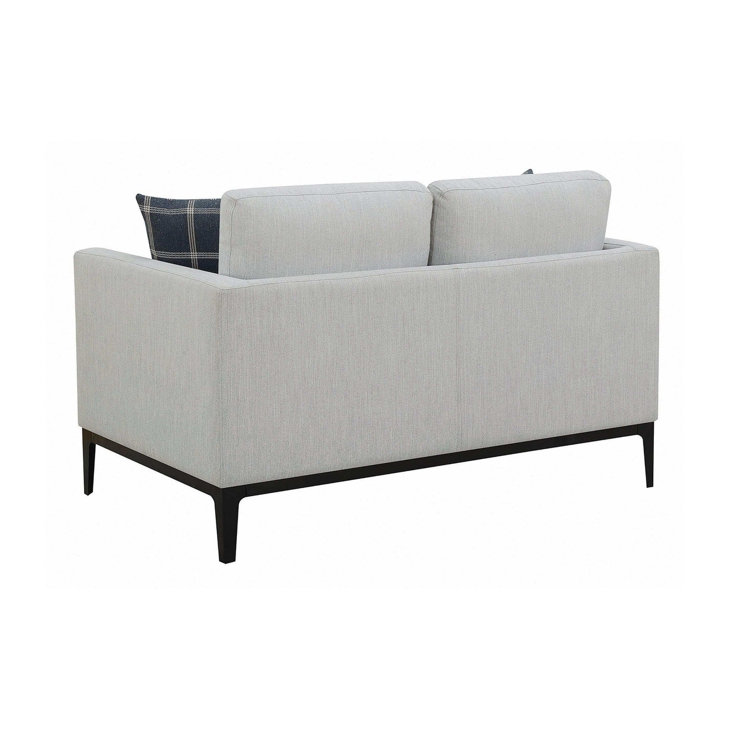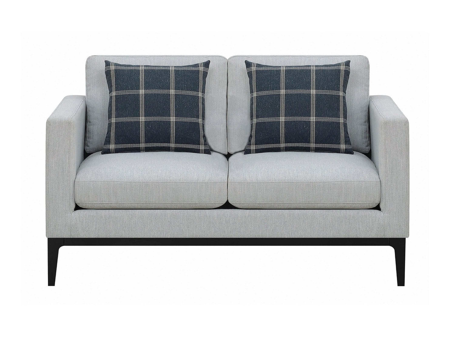 This loveseat is the ultimate in casual comfort. With a soft, plush back and seat cushions, it offers hours of soothing relaxation. Its lovely, muted shade of light grey blends effortlessly with a variety of color palettes. Two dark accent pillows with a pleasing plaid pattern provide a lovely contrast to its frame. This loveseat is a beautiful enhancement to any living room's decor.