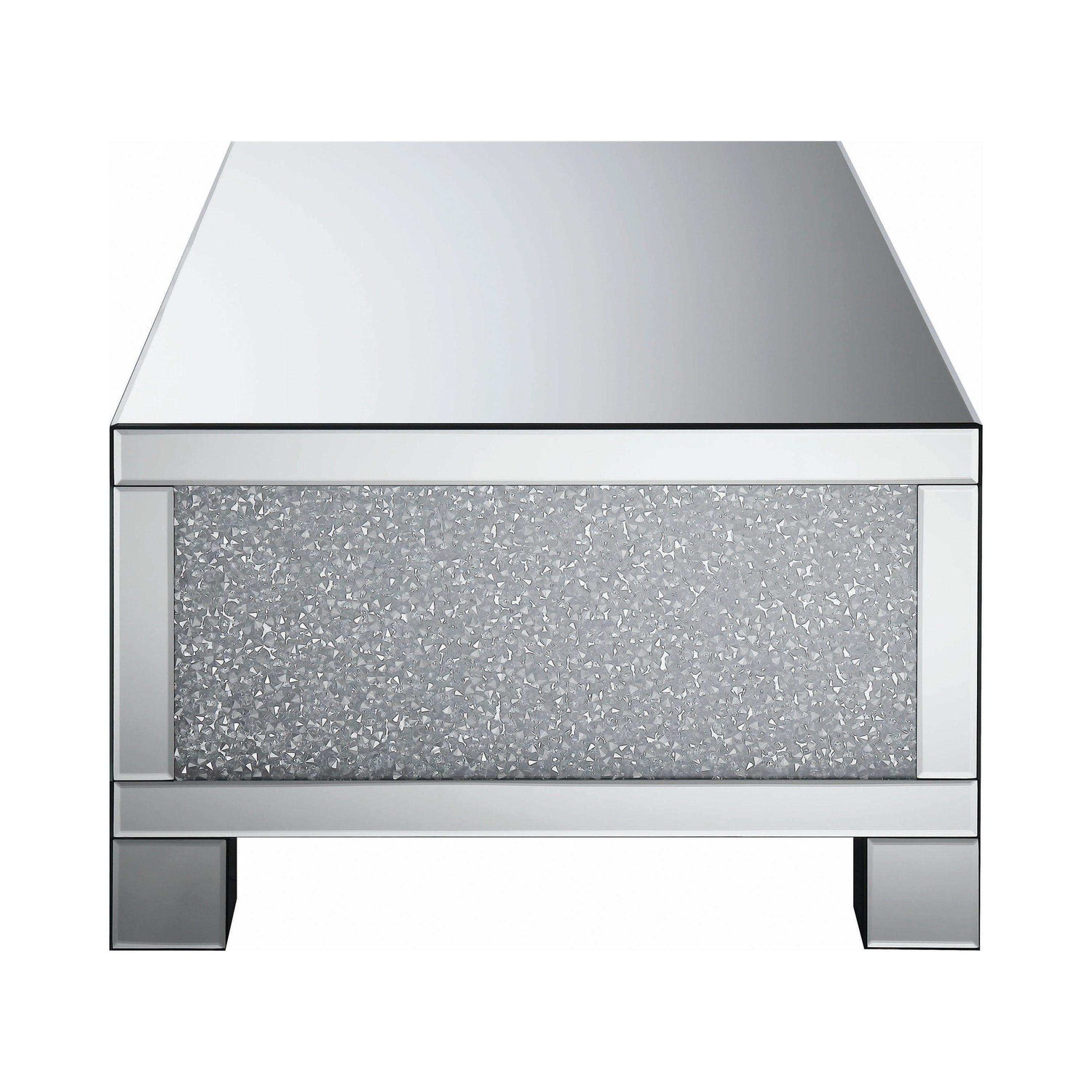 This solidly-constructed silver coffee table fits beautifully in a contemporary living room. Its straight lines show a fresh, clean ambiance. Short block legs convey sturdiness and stability. Sides have a unique pattern that goes well with the silver of the table top and legs. A silver accented vase matches well with the table for a custom look that's sure to please.