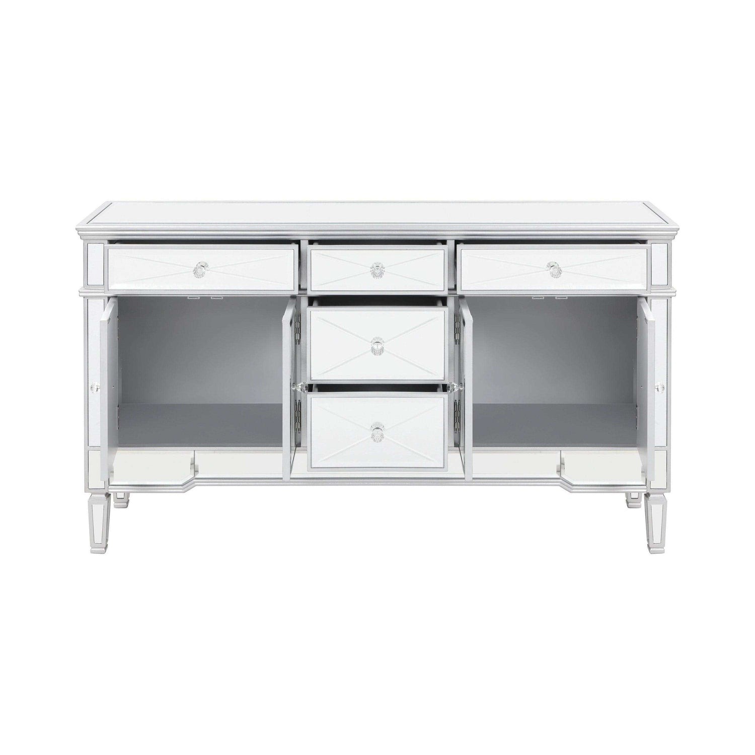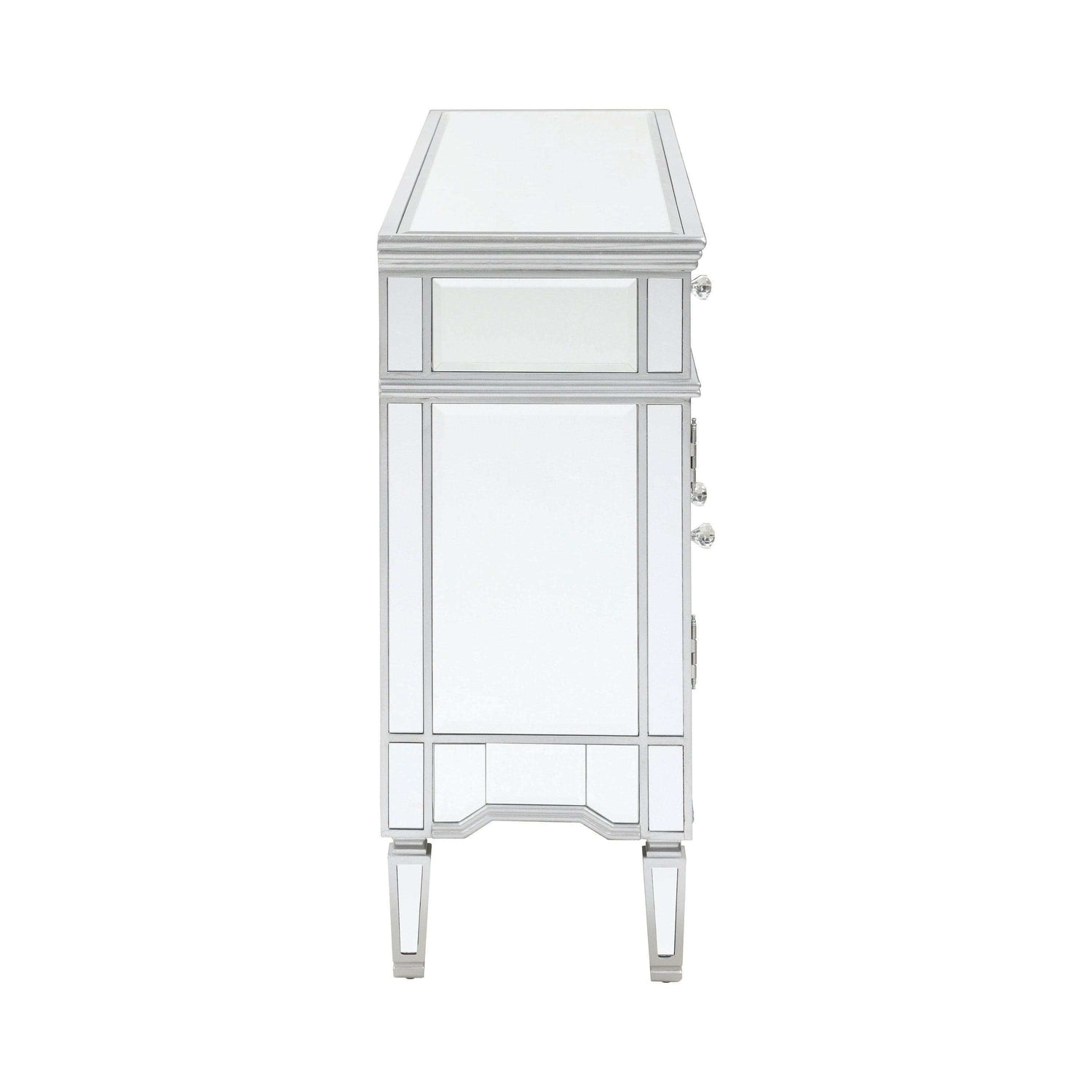 This mirrored accent cabinet has plenty of storage and panache. Fashioned from a combination of materials, it brings modern appeal and convenience to the home. It features birchwood and MDF construction in a silver finish to match the lustrous mirrored accents. Nine mirrored drawers with crystal hardware feature plenty of storage capabilities for all your needs. It's a fine addition to a modern styled living room or entertainment room.