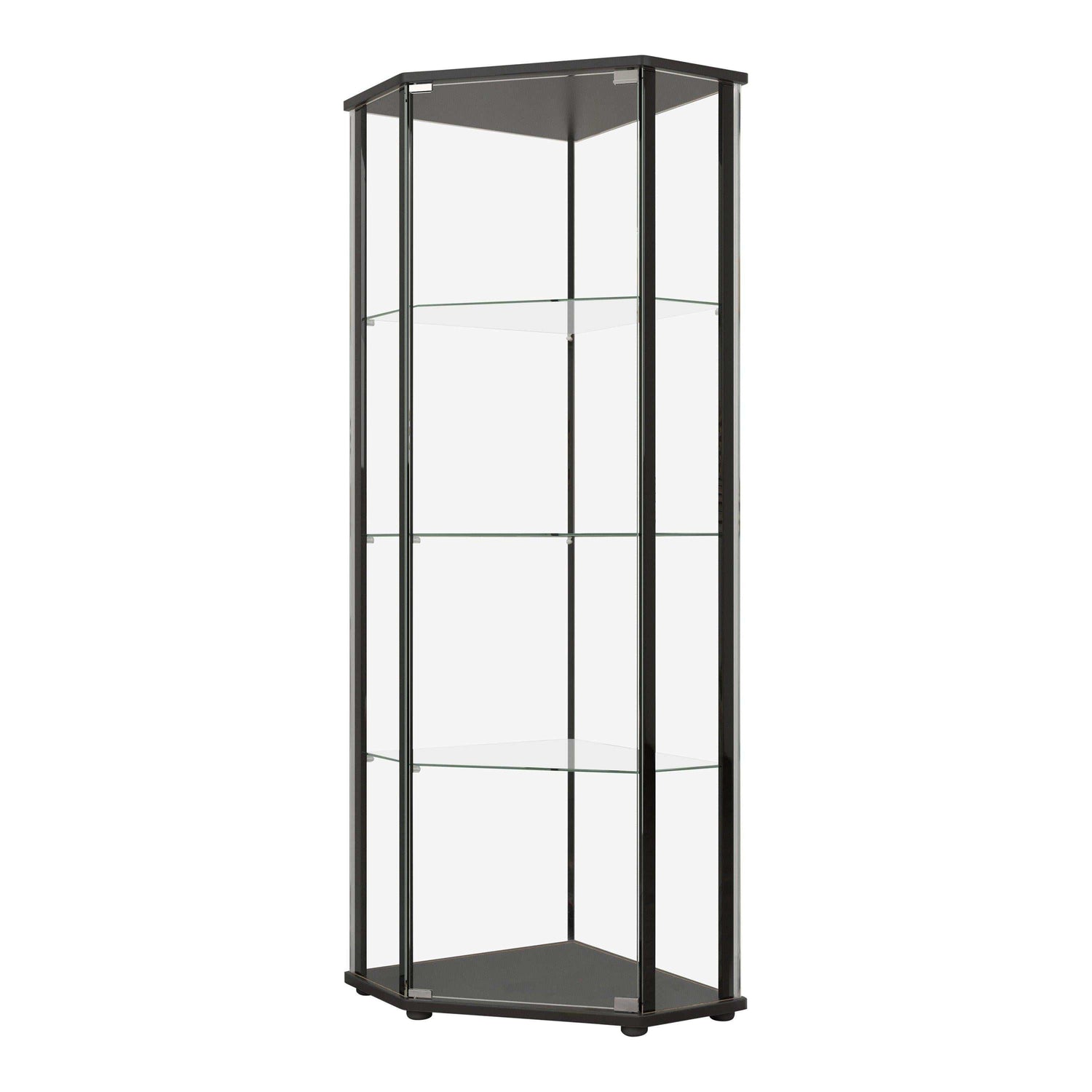 Bring your decor to elegant life with this stunning, modern curio cabinet. A triangular silhouette with cool, clipped corners adds artistic appeal to this glamorous piece. The sleek, metal supports flaunt a gleaming chrome finish. Three tiers of shelving offer elegant display space for photos and decorative keepsakes. Crafted of metal and tempered glass, this beautiful cabinet is built for superior strength and durability.