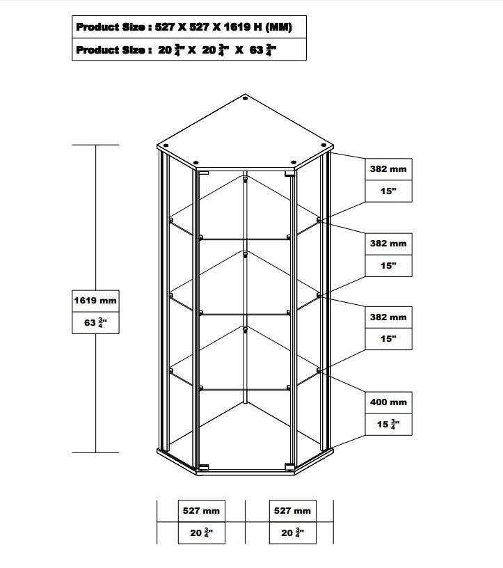- Modern curio cabinet with triangular top and bottom base provides classic elegance