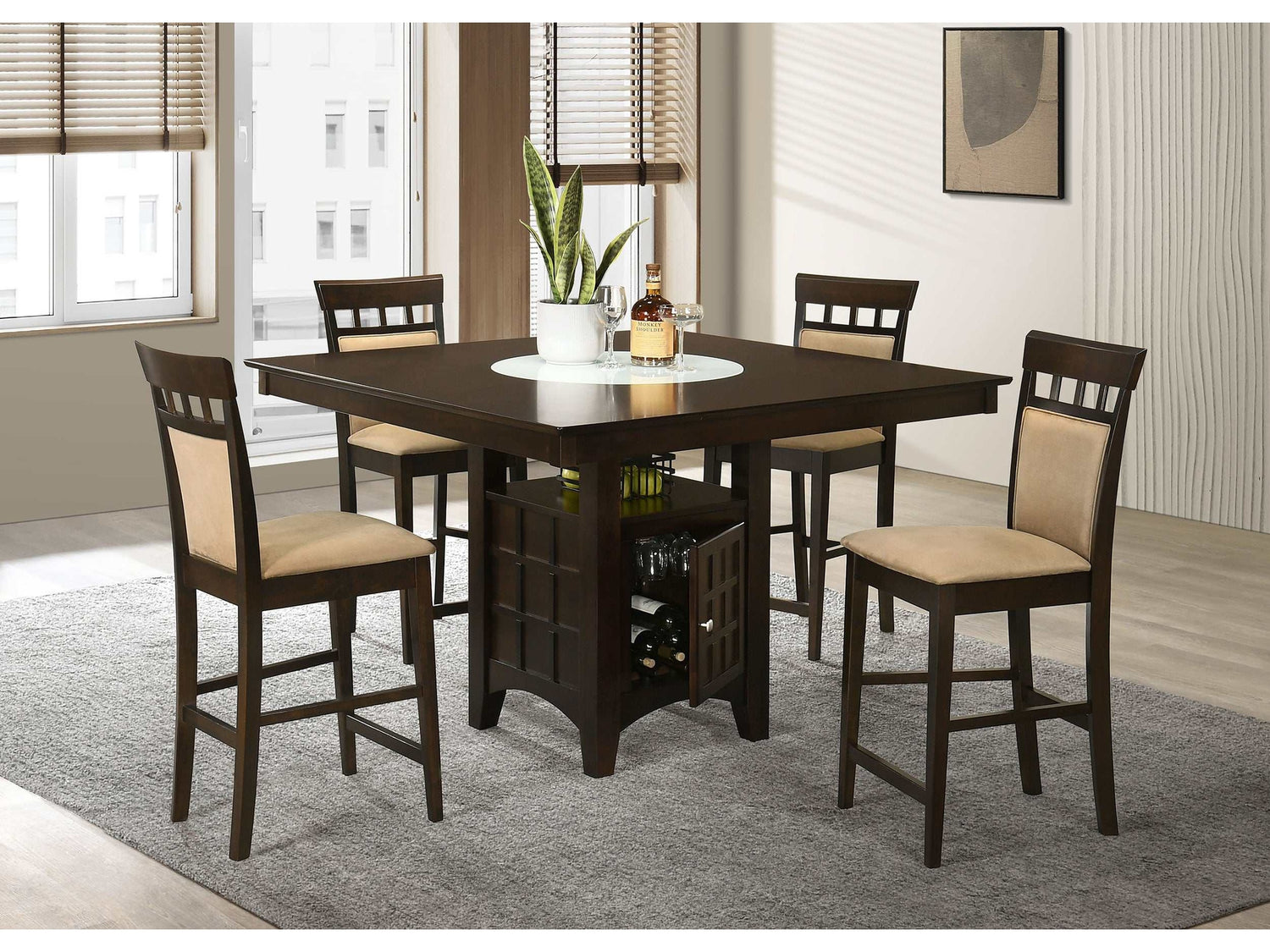 Appreciate the texture and dimension created with gris lattice details in a charming five-piece transitional counter height dining set. A rich cappuccino finish pairs with soft tan upholstery to create a neutral palette, perfect for creating a warm and welcoming ambiance in your kitchen or dining room. The set centers on a square dining table that includes a lower shelf and cabinet, offering multifunctional appeal that maximizes space utilization. The cabinet includes stemware and bottle storage to keep favorite vintages at your fingertips while enjoying delicious meals with friends and family. Chairs includes full backs and footrests for excellent support and comfort, while the open cube design lightens the overall look while ensuring rich dimensionality.
