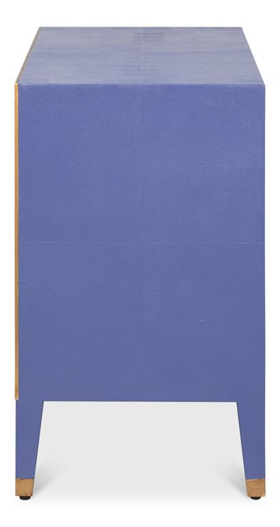 The Gabriella Blue Nightstand is a nightstand constructed from wood and embossed shagreen leather that provides functional storage for bedside items. This nightstand features a distinct Marlin Blue finish and incorporates gold hardware throughout. Its transitional design blends with various room decors, offering convenient access to personal belongings.