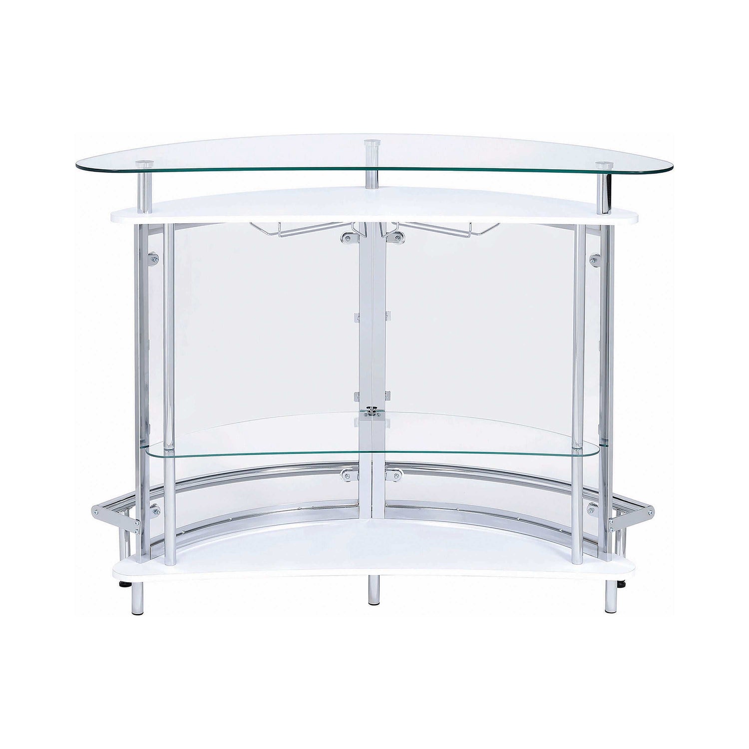 Upgrade your home entertainment options with this gorgeous, contemporary bar unit. With a convenient wine glass rack and ample storage space, it easily accommodates a wide variety of stemware, bar accessories, and cocktail ingredients. Graceful and glamorous, its curved silhouette is beautifully accentuated with gleaming chrome accents. A large, tempered glass top gives you plenty of prep space to mix delicious drinks for your guests. Complete with clear acrylic panels, this stylish unit allows you to show off your collection of fine wines and spirits in style.