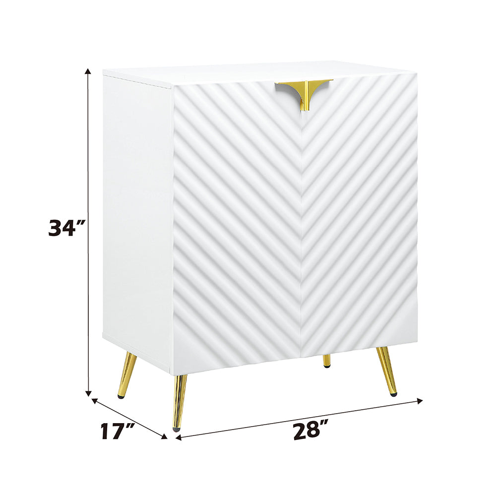 The Gaines Living Rooms Collection is a glamorous and sophisticated grouping that adds a chic style to any room. The white gloss finish and gold metal accents help to accentuate the clean lines of the pieces and add a pop of glamour. The diagonal line design adds visual interest and texture, making each piece stylish.