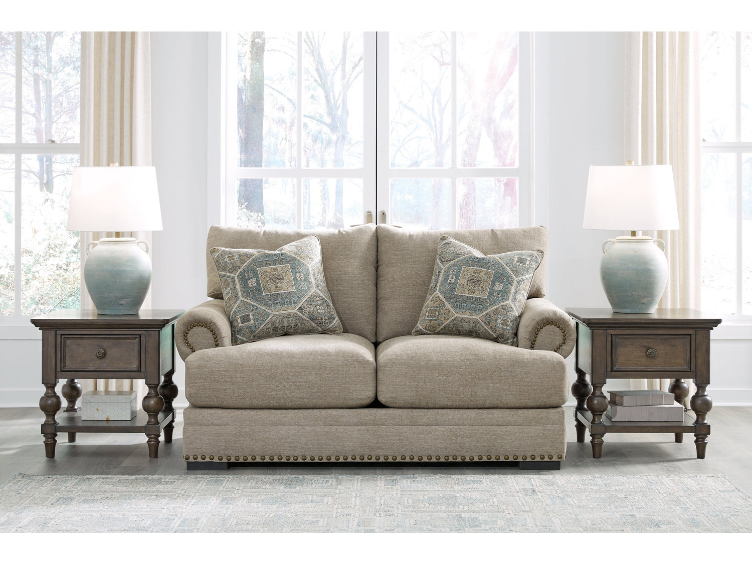Looking to enhance your home's visual appeal? This loveseat offers sophisticated design, comfort and elegance with tonal colors, roll arms and nailhead accents. Enjoy optimal coziness as you nestle into luxurious soft upholstery and feather-blend cushions. Perfect for modern spaces, it's just the spot to sit back and relax in style.