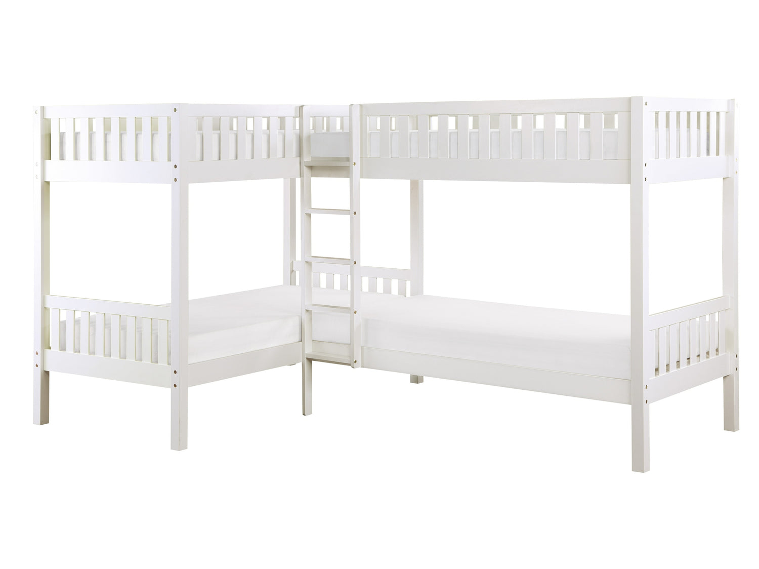 Maximizing sleep space is achieved with the stylish Galen Collection. This transitional corner bunkbed is featured in a white finish making it an appropriate choice for a number of youth bedroom settings. The four twin beds that comprise the unit conjoin to fit perfectly within your available space.