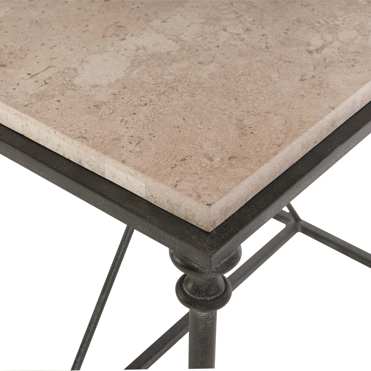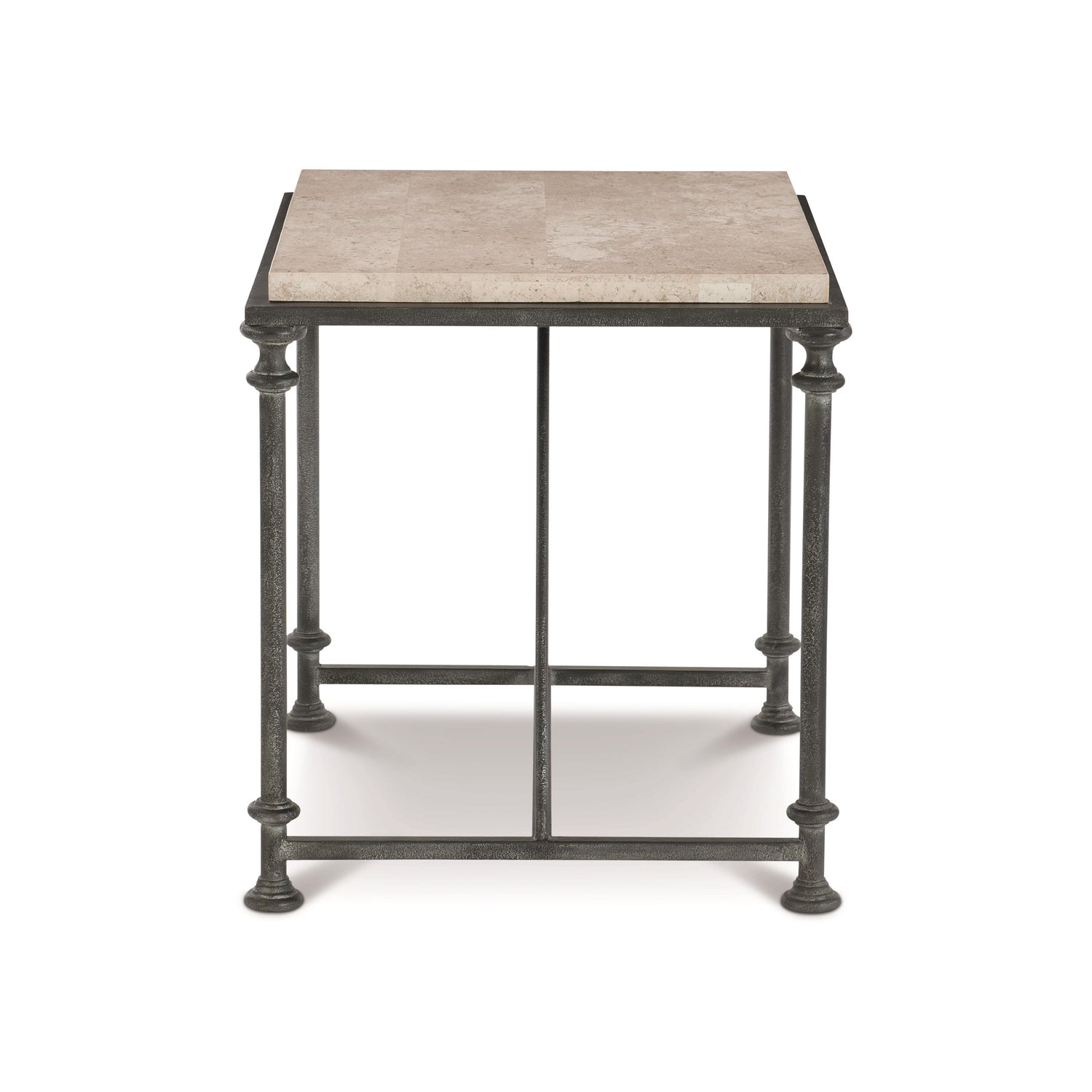 A timeless classic, the Galesbury end table pairs unique materials in its architectural design. Crafted from solid and tubular steel in an antique silver finish, the sleek base features slender, shapely legs reminiscent of columns. The stretchers form a triangle that leads the eye to a square-cut travertine stone top. The smooth, cream-colored stone lends natural beauty and a luxurious allure.