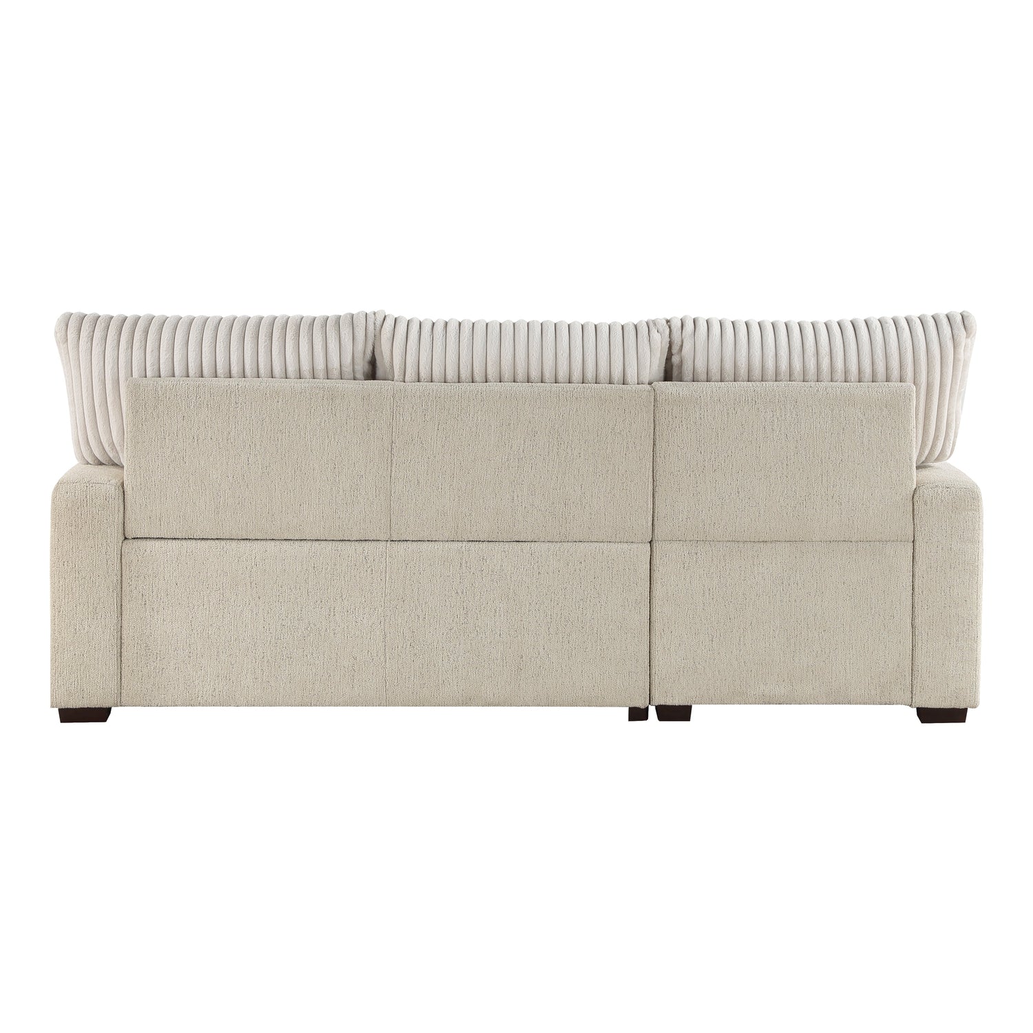 The visual and textural combination that defines the design of the Gallatin Collection presents a functional, and comfortable addition to your casual living room. Beige boucle fabric upholstery covers the body of the sofa while the plush texture of the light gray wide wale corduroy back cushions lends luxurious texture to your seated experience. The drop-down center back cushion of the right-side two-seater opens to reveal a tabletop and cupholders while the pull-out bed opens to match length with the left-side pop-up chaise, which opens to reveal hidden storage perfect for your extra pillows and blankets. The sofa is available in both left and right chaise configurations for perfect pairing to your available space.