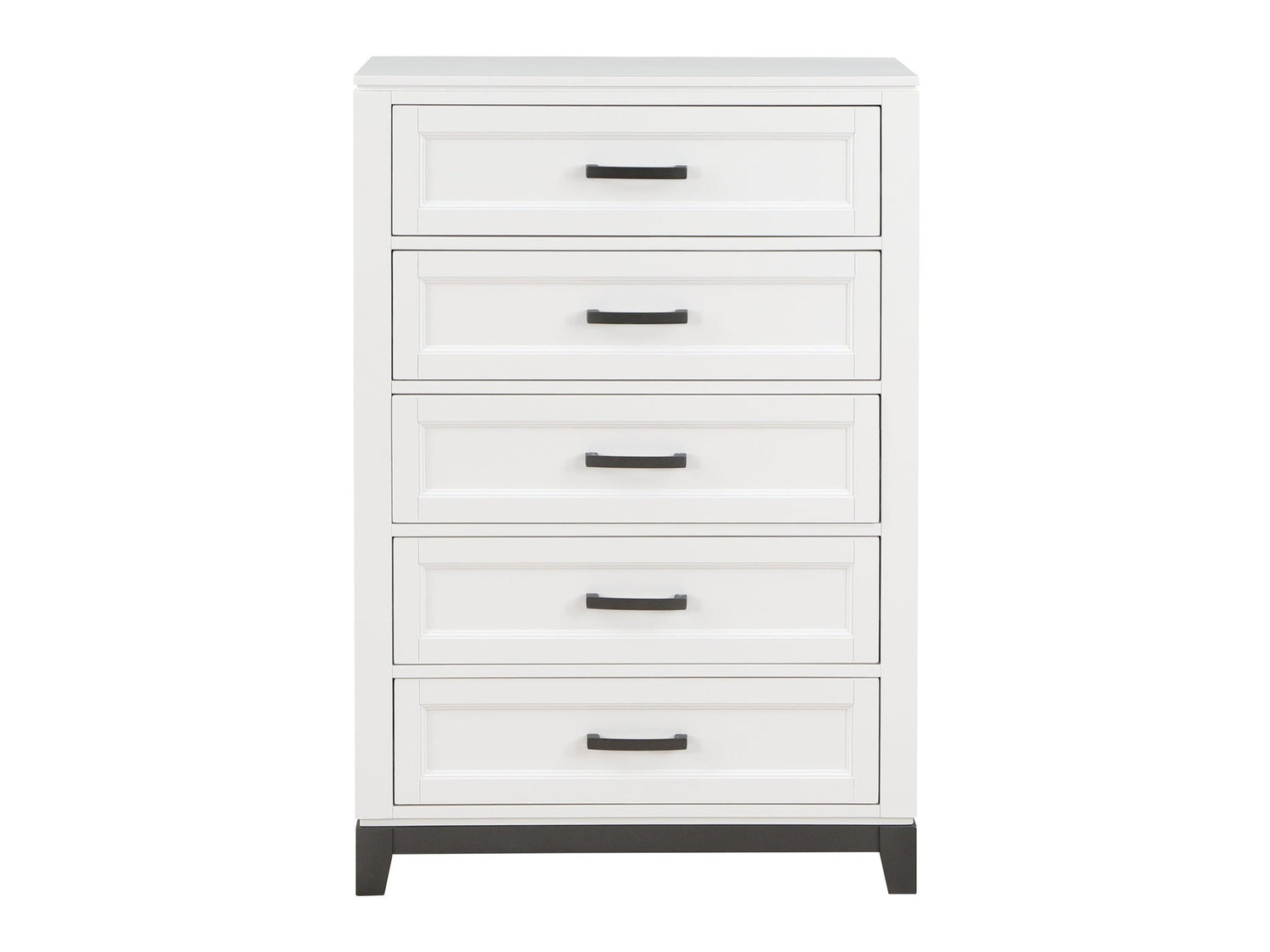 The Garretson Collection blends transitional lines with rustic styling to create an elegant addition for your bedroom. The chest features a white finish while metal bar hardware accents the picture frame drawer fronts of the chest.