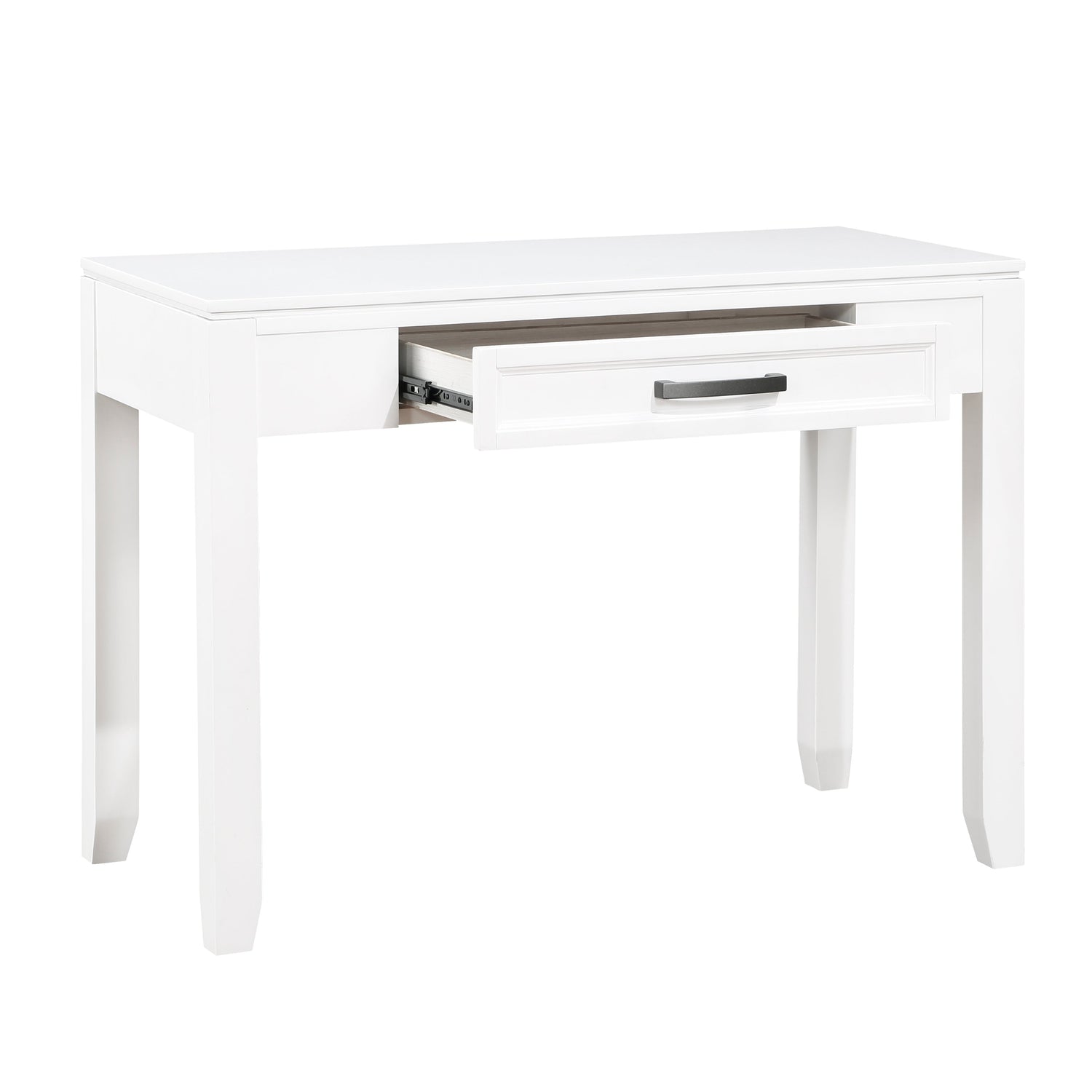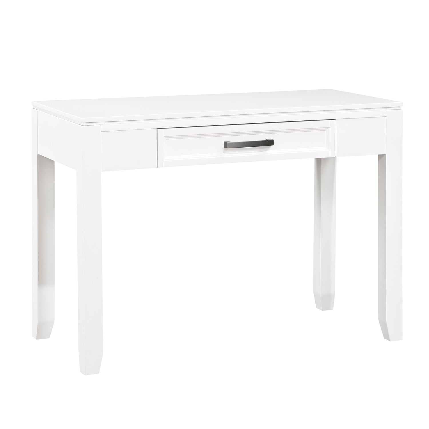 The Garretson Collection blends transitional lines with rustic styling to create an elegant addition for your bedroom, living room, or home office. The desk features a white finish, and a centrally located single drawer with a black-finished metal bar pull.