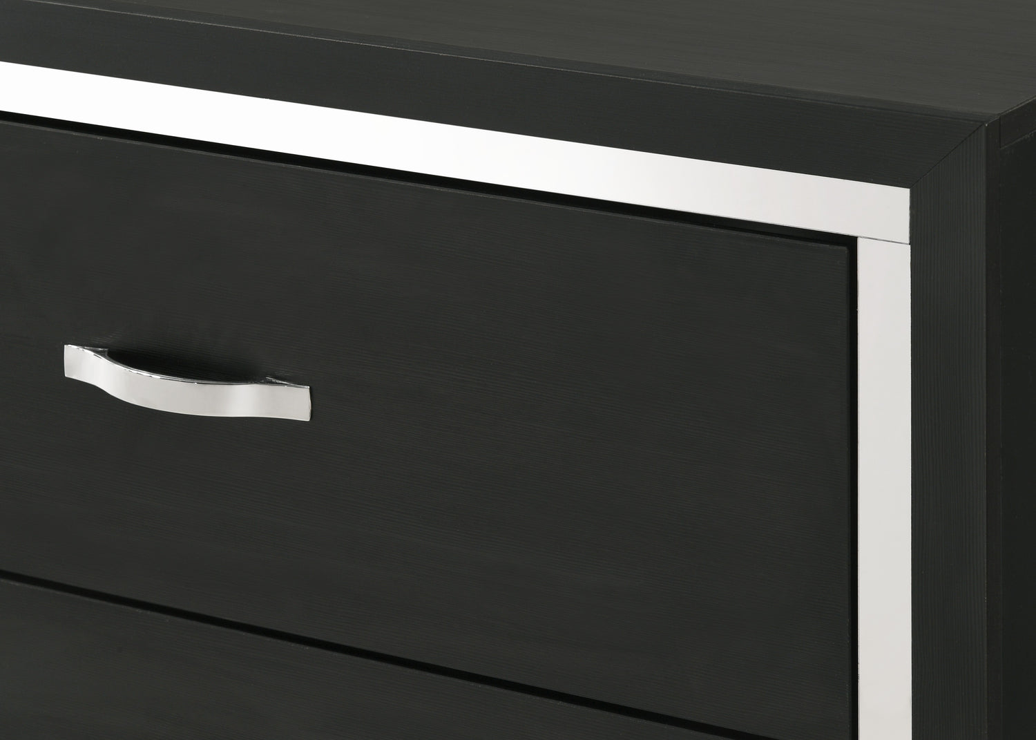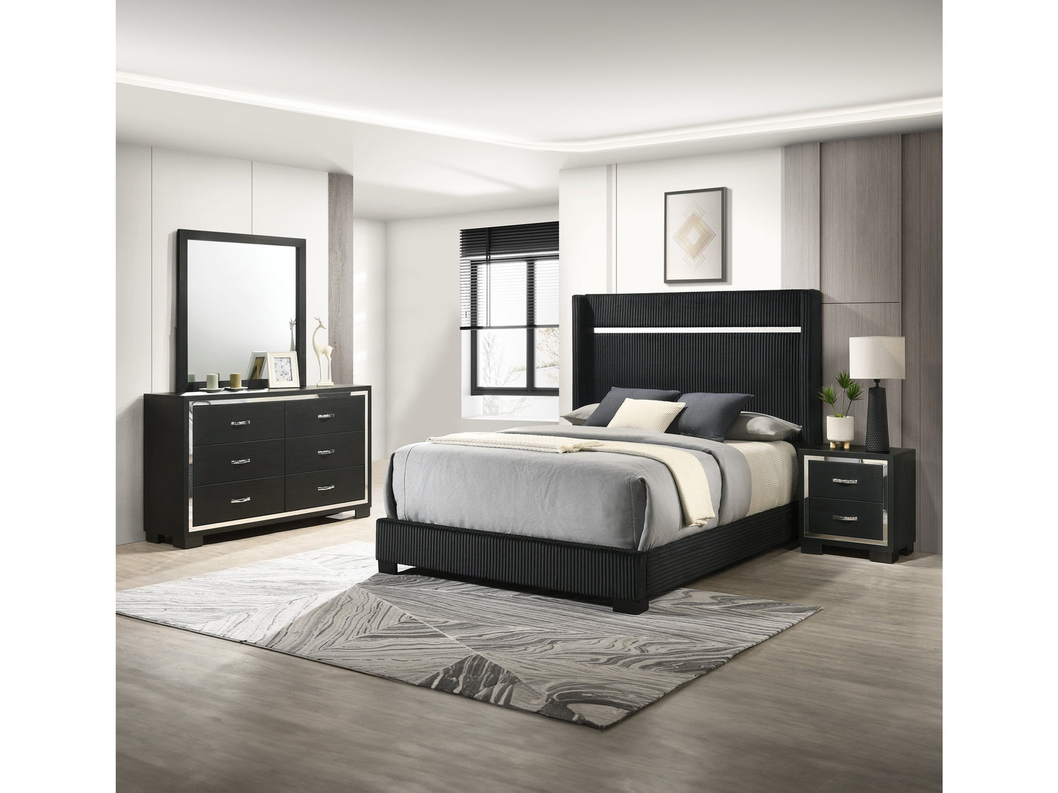 The Gennro Black Upholstered Panel Bedroom Set brings a bold and refined presence to your space with its dramatic design and luxurious details. The standout feature is the tall, channel-tufted headboard, offering an elegant focal point that elevates the room’s atmosphere. Complementary case pieces in a deep black finish enhance the set’s modern appeal, while the clean silhouettes and minimalistic touches create a harmonious blend of confidence and sophistication. Designed to suit both contemporary and transitional interiors, this collection delivers style without sacrificing functionality.