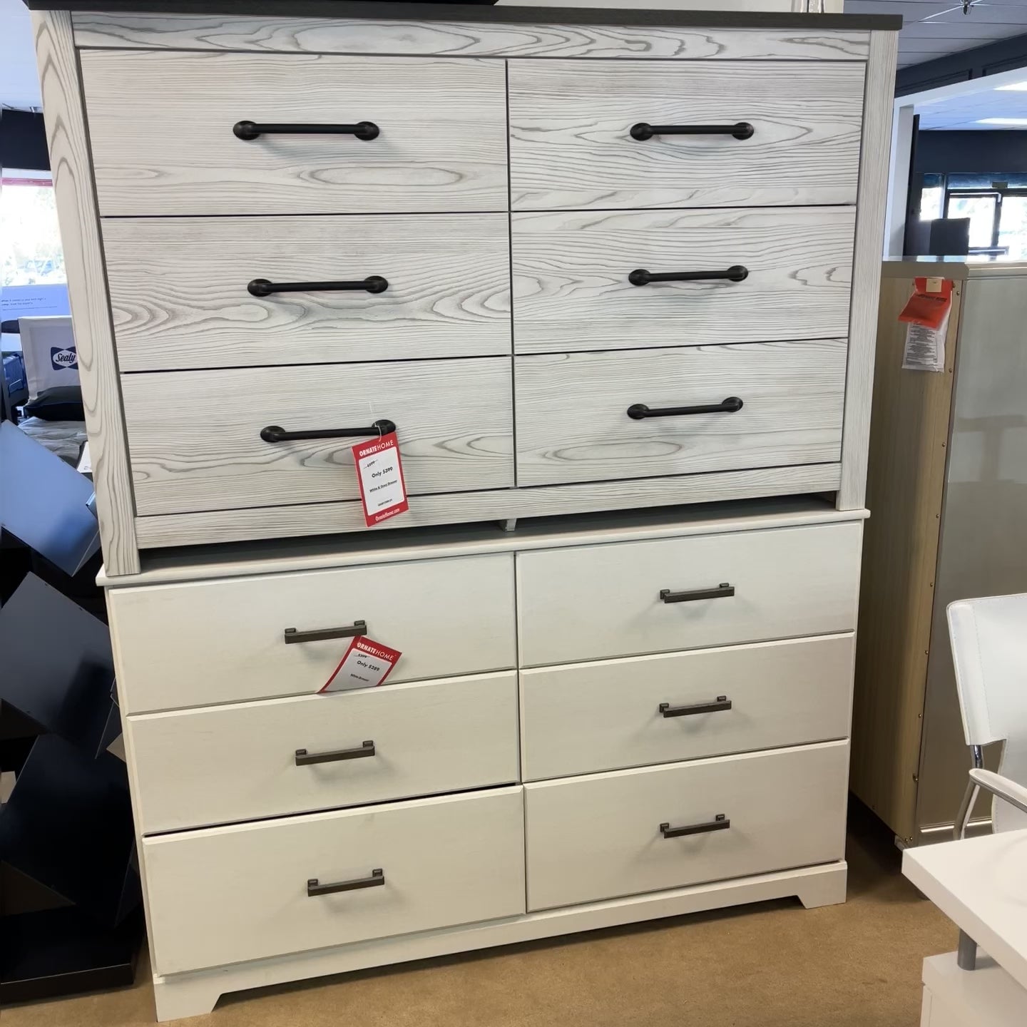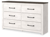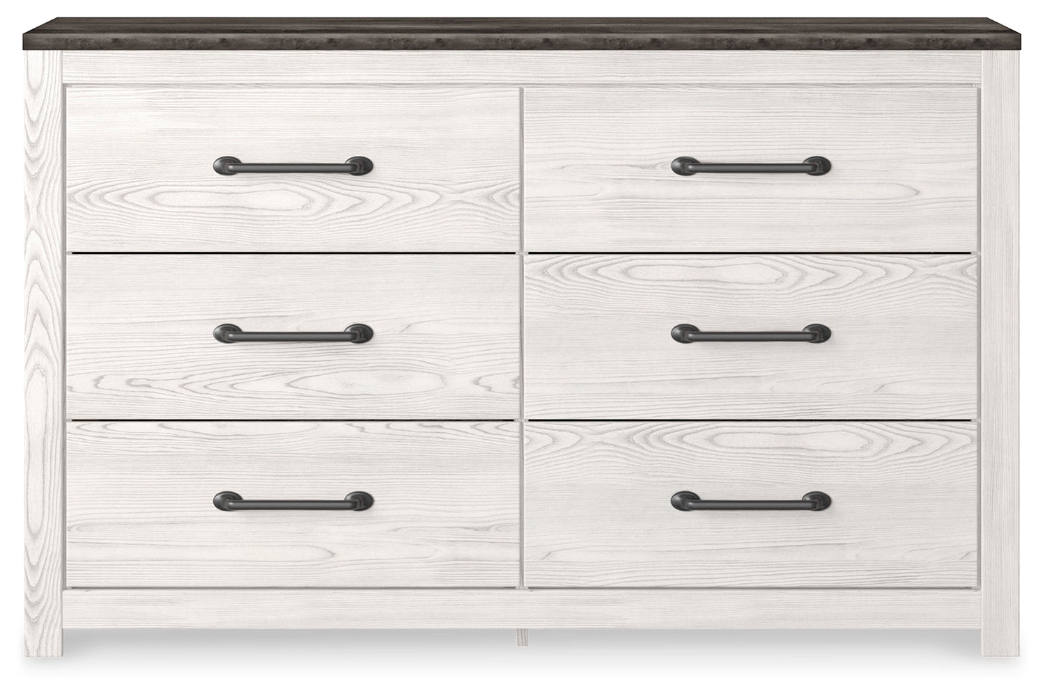 Cool, clean and casually modern. This dresser’s wispy whitewash and gray finish sets the tone for your calming sanctuary. Large linear pulls add dimension and authenticity. Six smooth-gliding drawers neatly accommodate your wardrobe needs.