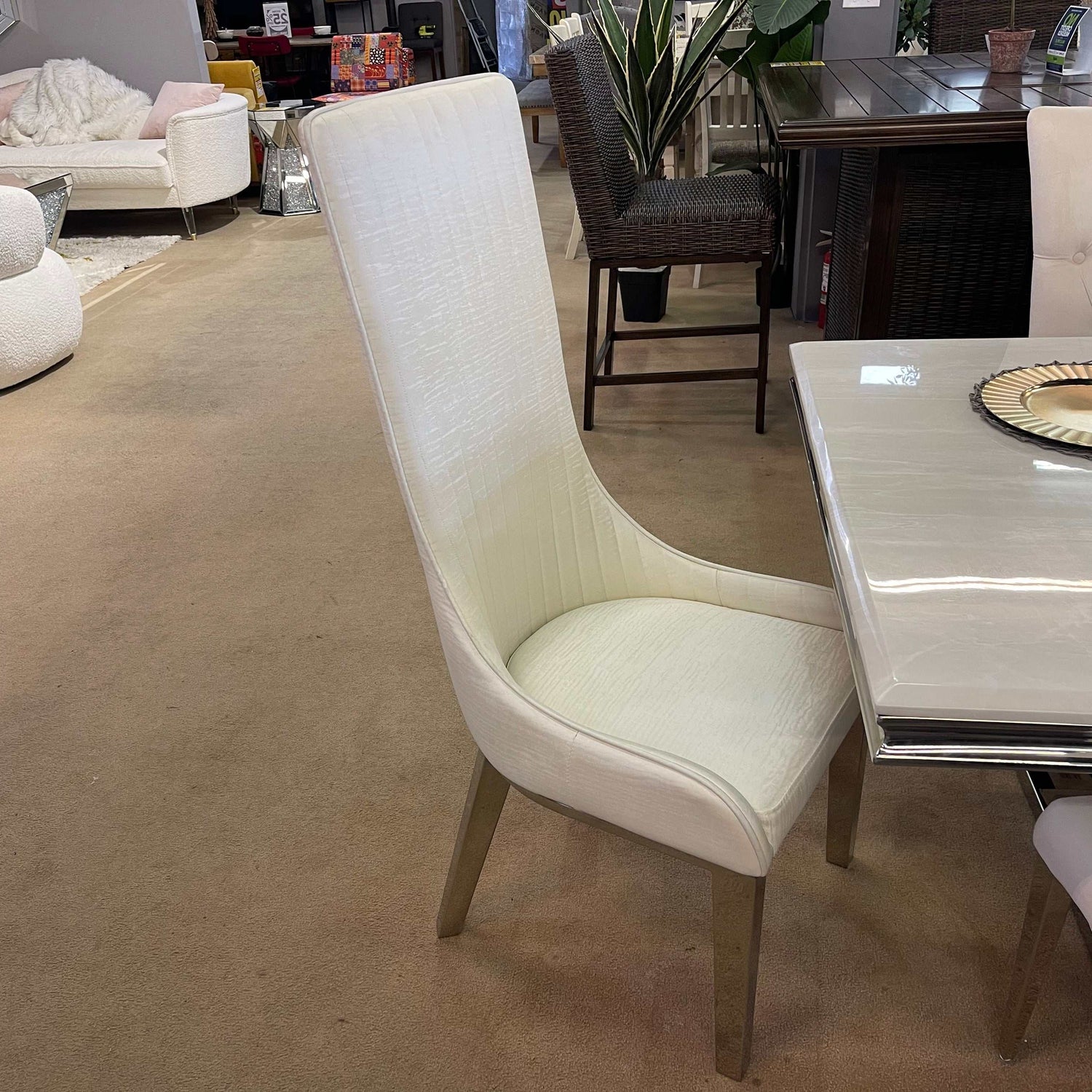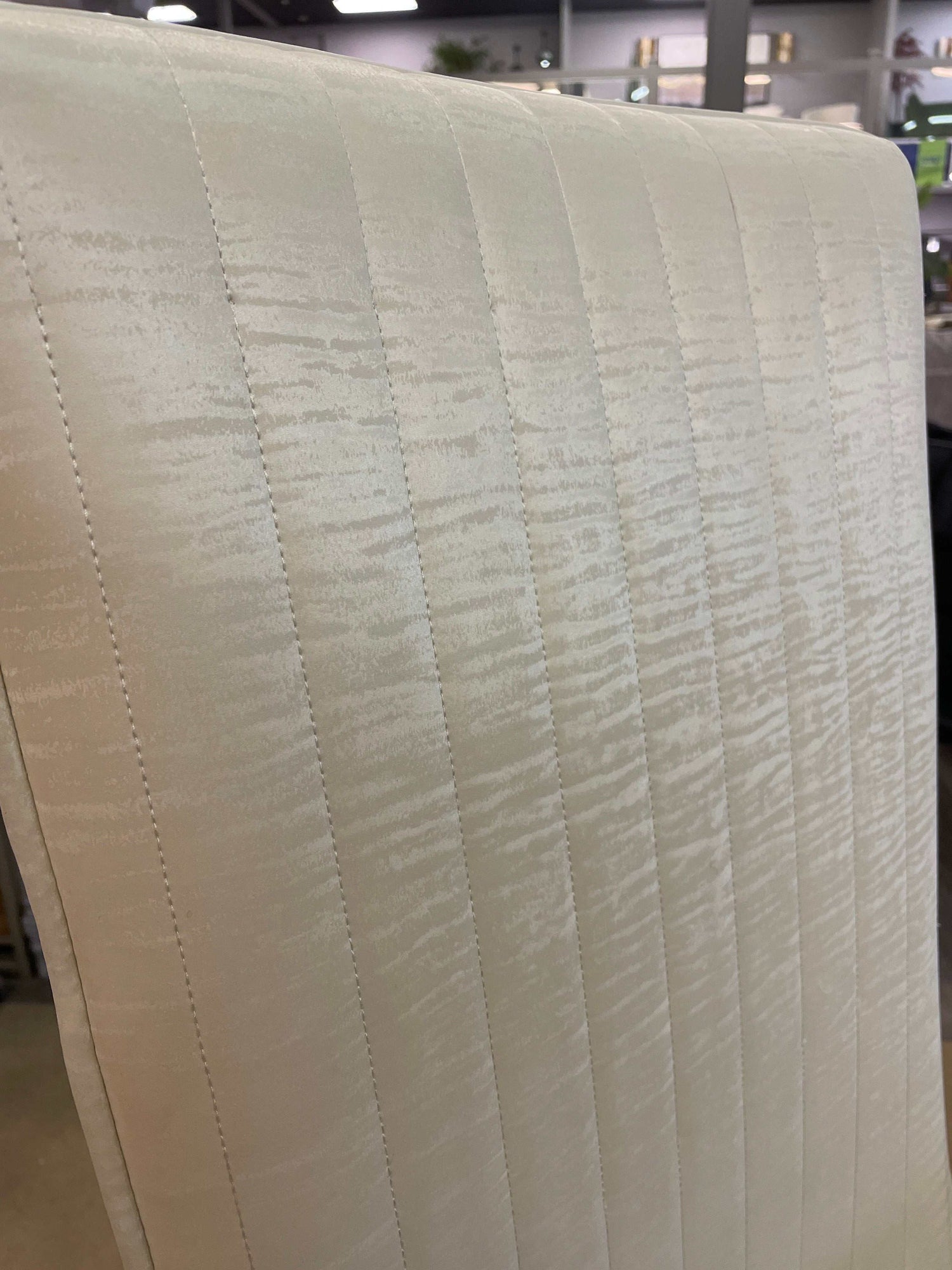 The Gianna Dining Chair Set has that modern minimalistic clean look that fits right in with your existing furnishings. The subtle vertical stitching creates visual interest against the neutral white faux leather while the high backrest and curved design offer comfortable seating that quietly hugs your every movement. The robust stainless steel legs easily add an additional layer of chic to any room.