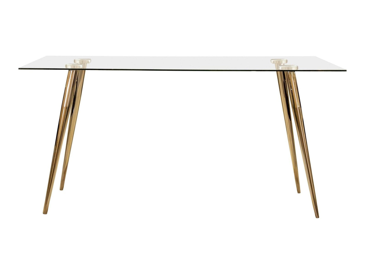 Super stylish with a mid-century modern flair, this dining table is as sleek as they come. Clean lines and an open and airy design offer a transitional twist to this dining table, making it a stunning artistic piece. A rectangular glass tabletop floats elegantly above, supported by flared and tapered legs in a lustrous metal finish add a shimmer to the space. Choose between warm or cool metal tones to tie together your existing decor and complete a space. In addition, this spacious dining table lends itself nicely to contemporary homes.