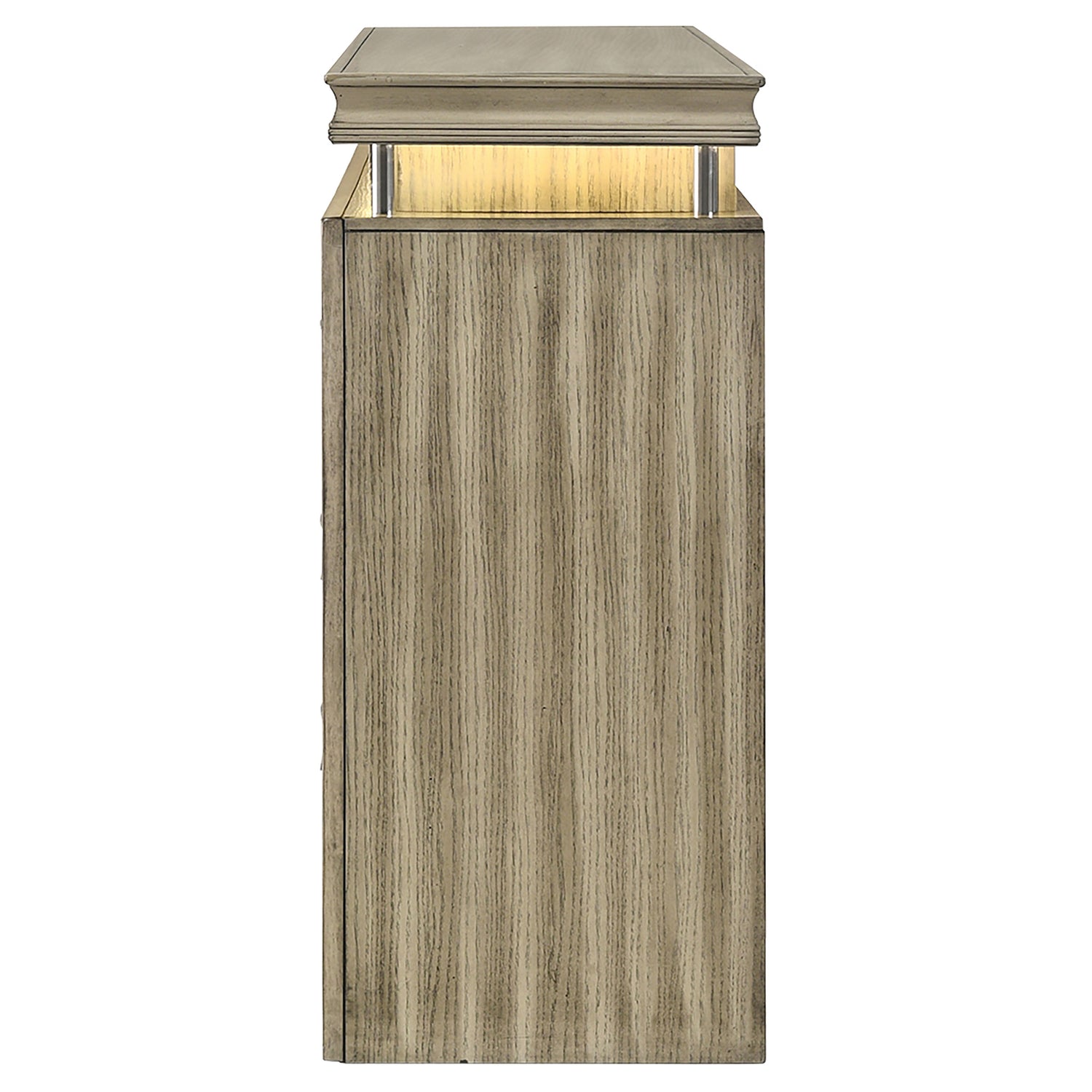 - Rustic beige wood grain finish is soft and neutral, appealing in a variety of bedroom settings