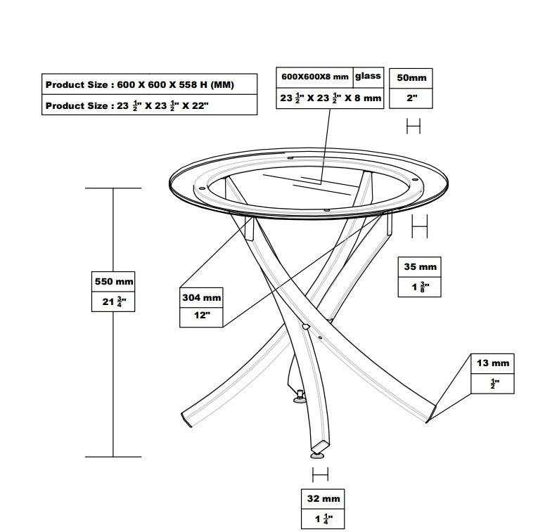 - Width: 23.5" Depth: 23.5" Height: 22"