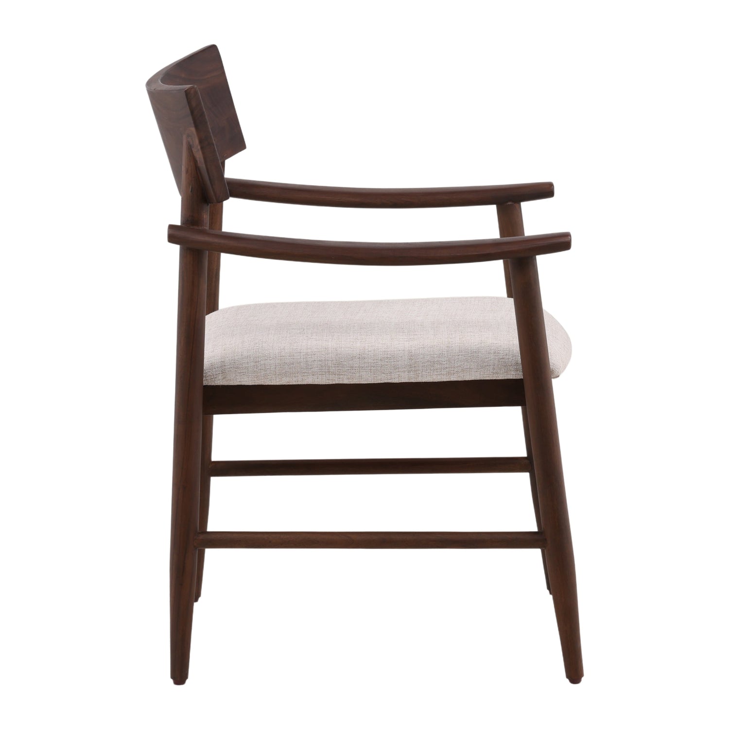 The Glen Dining Chair features a sturdy acacia wood frame paired with a soft cotton blend fabric seat. The dark brown wood finish contrasts beautifully with the cream upholstery, creating a sophisticated and balanced look. Perfect for adding a touch of warmth and elegance to any dining space.