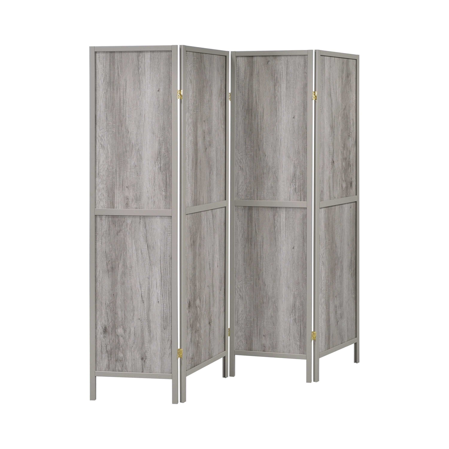 Cast a soft glow throughout a classic space with this four-panel screen. Variations in hue give the exposed wood grain depth with a grey driftwood finish. Light in color, the sleek legs mirror the wood finish to complement and add structure. The panels create a modern aura in any shared space with their soft coloring and clean silhouette. Connecting the panels is hardware that adds a pop of warmth.