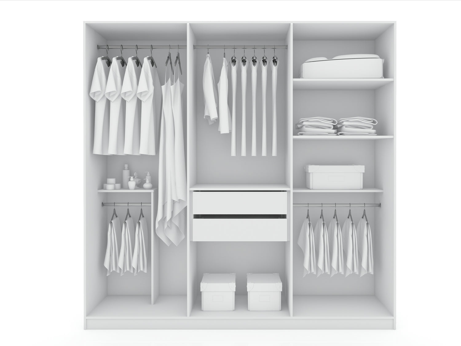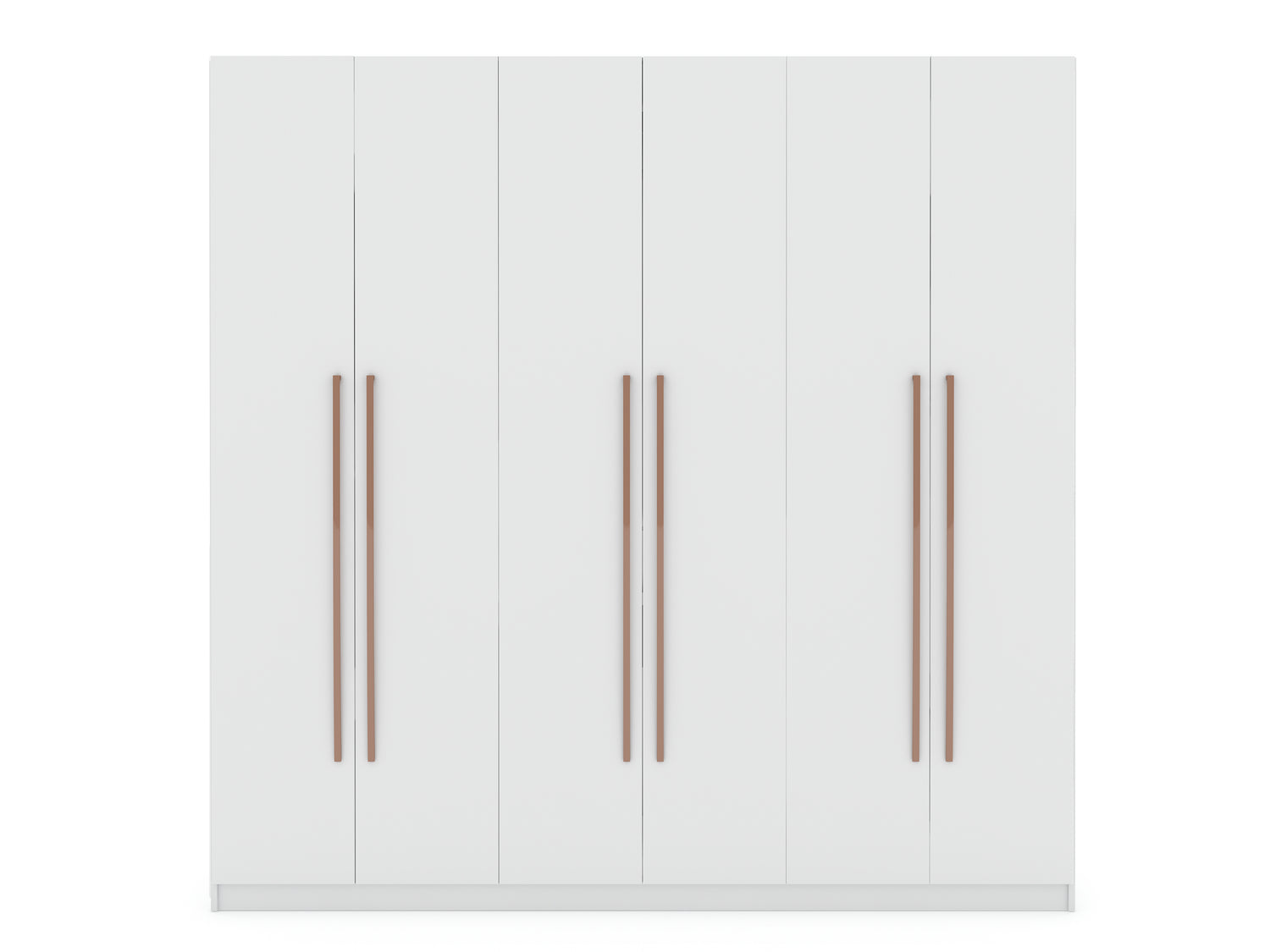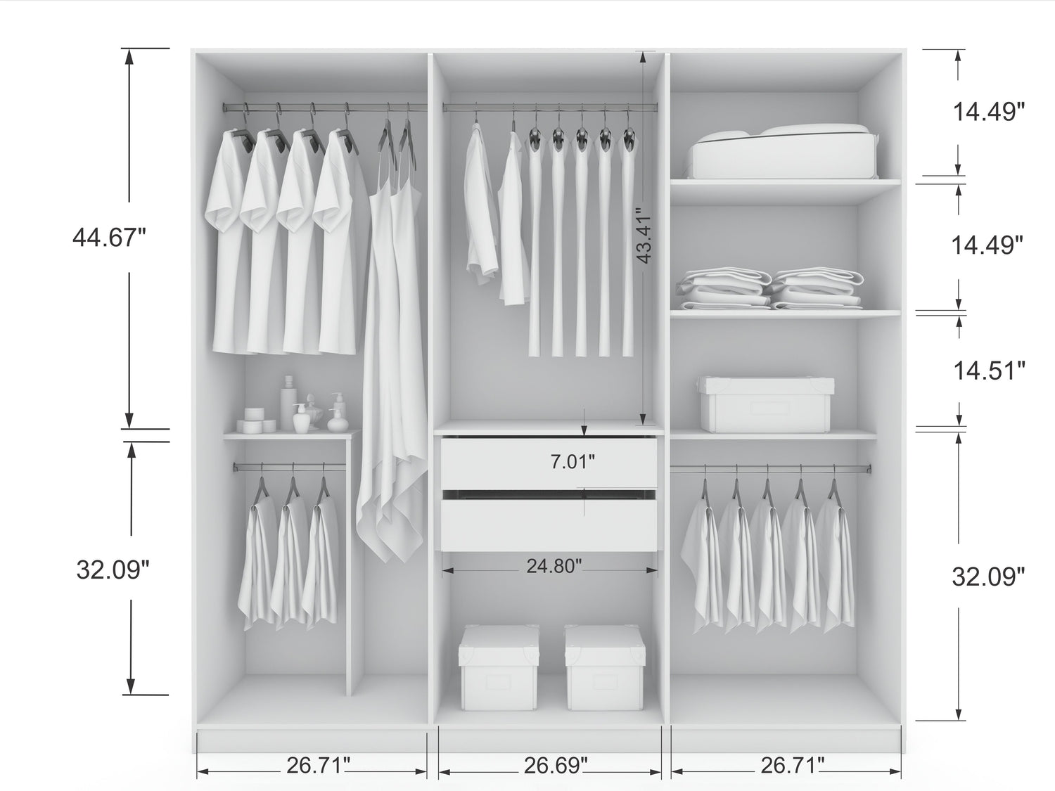 - 3-Sectional Wardrobe Includes 4 Fixed Shelves, 4 Aluminum Hanging Rods, and 2 Center Drawers.