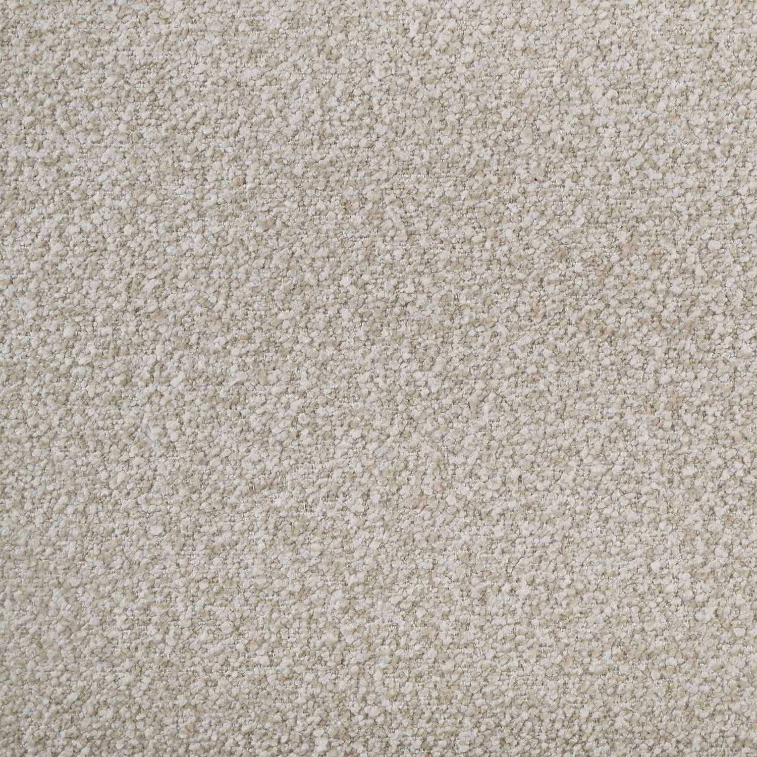 - Upholstered headboard in beige boucle provides soft texture and comfort