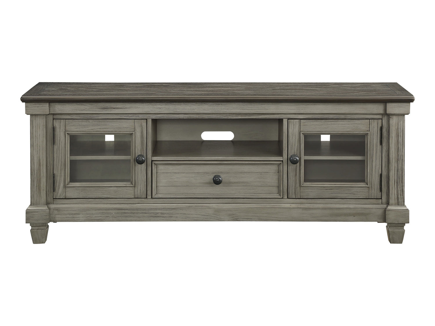 Inspired by the aesthetic of a casual country home and providing ample storage space for your media accessories is the 64-inch TV Stand of the Granby Collection. The two-tone look of the acacia and pine solids base, finished in antique gray, and the oak veneer of the unit’s coffee-finished top, present as a harmonious combination of color, perfect for your entertainment area. Behind glass door storage as well as open media access and drawer storage create a functional addition to your home.