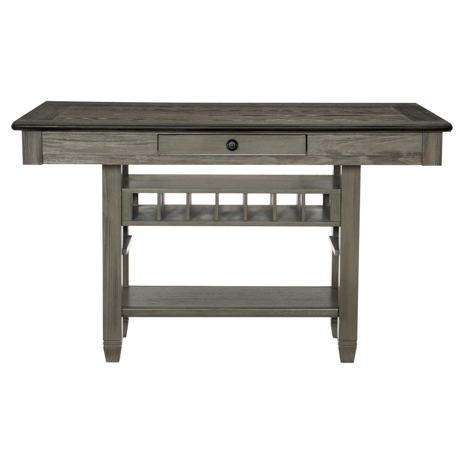 Inspired by the aesthetic of a casual country kitchen, the Granby Collection is an inviting gathering spot for mealtime with family and friends. The 36-inch counter height table features 4 drawers on the apron and a storage display shelf base with a wine rack. The two-tone look of the acacia and pine solids base, finished in antique gray, and the oak veneer of the coffee-finished tabletop, present as a harmonious combination of color, perfect for your home. The drawers on the table apron feature dark metal knob hardware. The wood frame of the counter-height side chair is finished in antique gray and features a neutral-tone gray fabric seat.