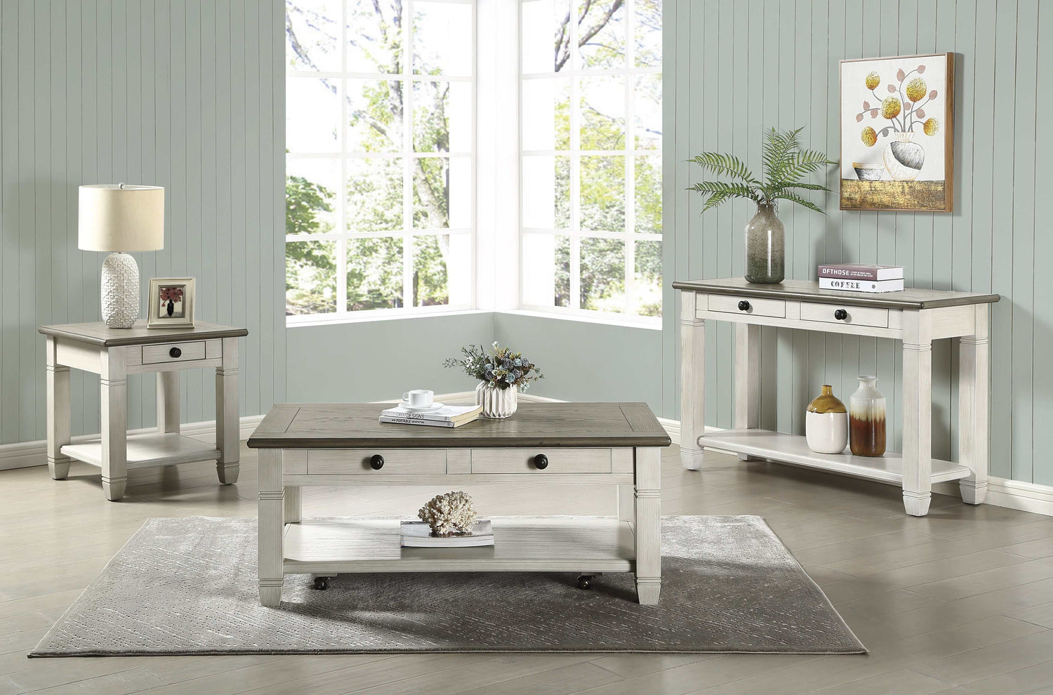 Inspired by the aesthetic of a casual country home and providing a functional decorative accent for your living room is the occasional table set of the Granby Collection. The two-tone look of the acacia and pine solids base, finished in antique white, and the oak veneer of the cocktail table’s rosy brown-finished top, presents a harmonious combination of colors, perfect for your home. Dark-finished metal knob hardware fronts the functional drawers of the cocktail table while providing subtle contrast to the finish of the collection. An open display shelf creates a perfect spot for the display of your decorative accessories, while casters allow for ease of movement of the cocktail table within your space..