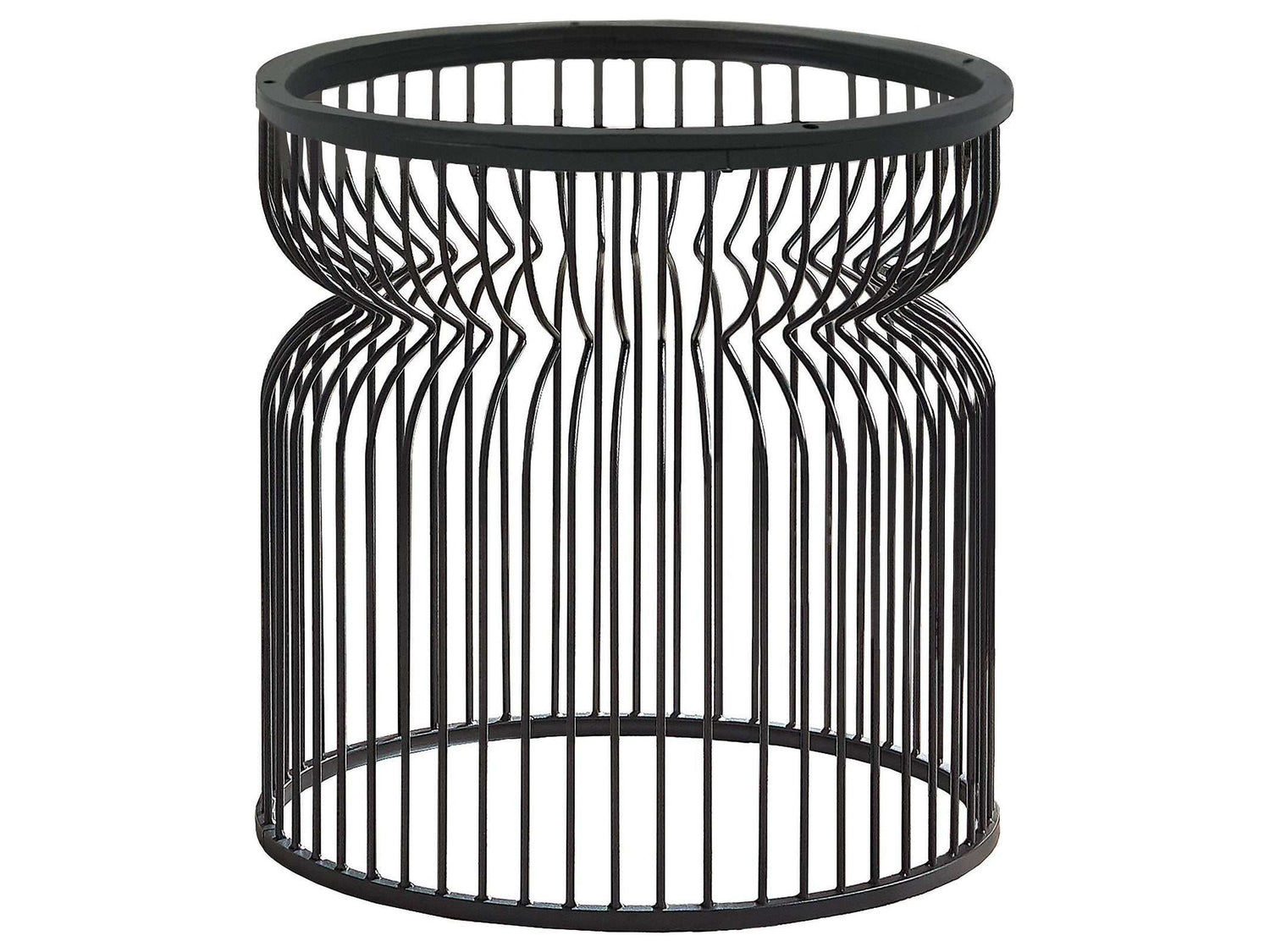 Versatile and stylish, this sculptural-like dining table features a stunning cage-style design. Round in shape with sleek, thin metal rods all around, it has a pinched top section that lends a softly curved edges and a supportive open base that sits flush to the floor. Made entirely of metal, this contemporary table base offers a dark gunmetal finish that can blend easily with existing colors and decor. In addition, this table base allows you to customize your table's size, choosing from large beveled clear glass or even marble. Create the exact table you need!