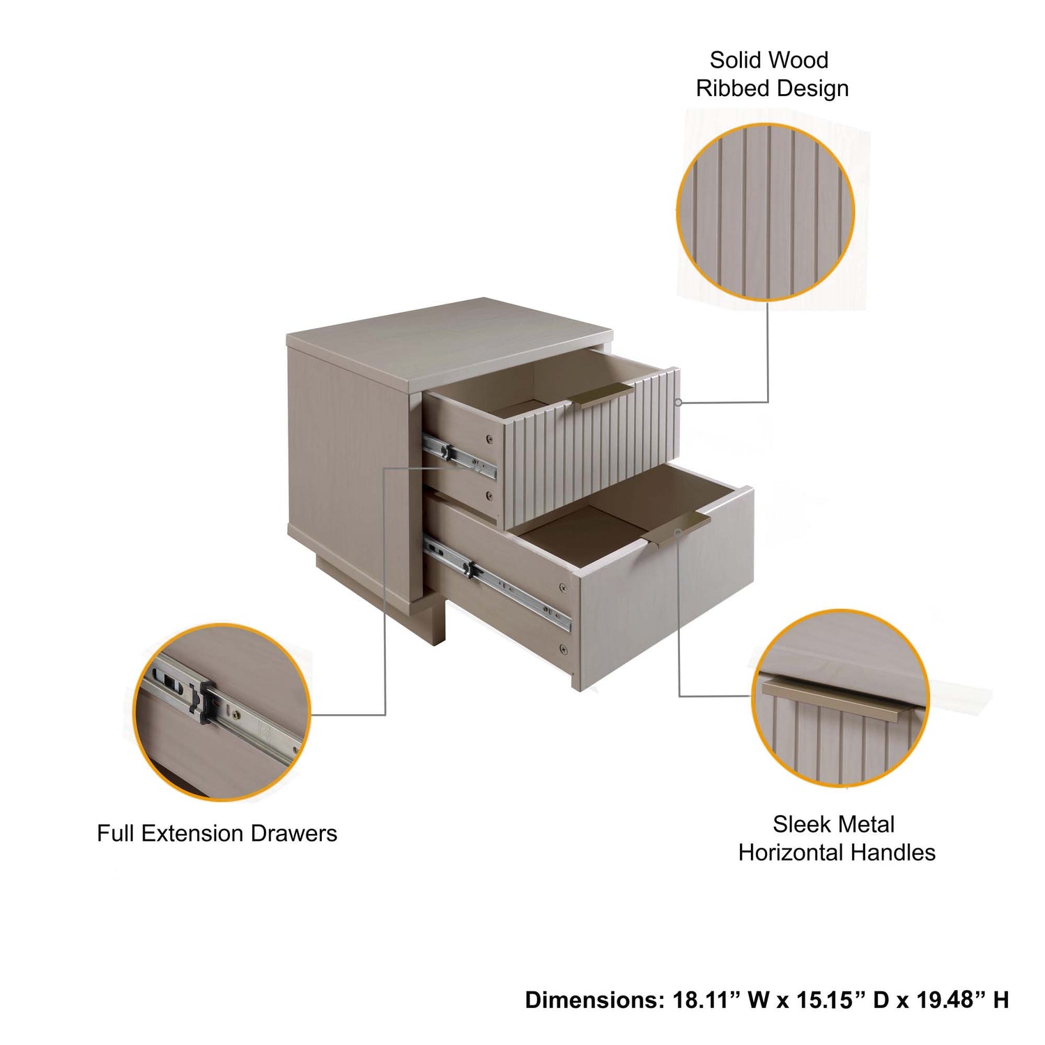 - Includes 2 Full Extension Drawers with Top Drawer Designed in Vertical Textured Ribbed Lines Made from Solid Wood.