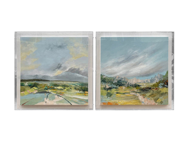 - Set of two hand-painted landscape canvases in soothing natural tones