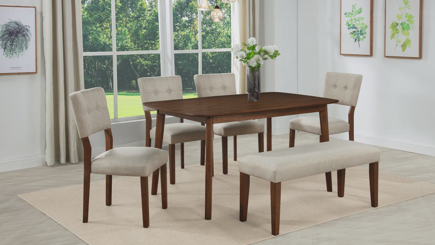 Create a warm and sophisticated dining atmosphere with the Gregory Dining Group, combining timeless craftsmanship with modern comfort. The wooden table with gently rounded edges serves as a welcoming centerpiece, complemented by plush, tufted upholstered chairs and a coordinating bench. Sturdy wooden legs provide lasting durability while maintaining elegant proportions. Ideal for contemporary and transitional interiors, this ensemble balances function, style, and comfort for everyday meals and special gatherings.