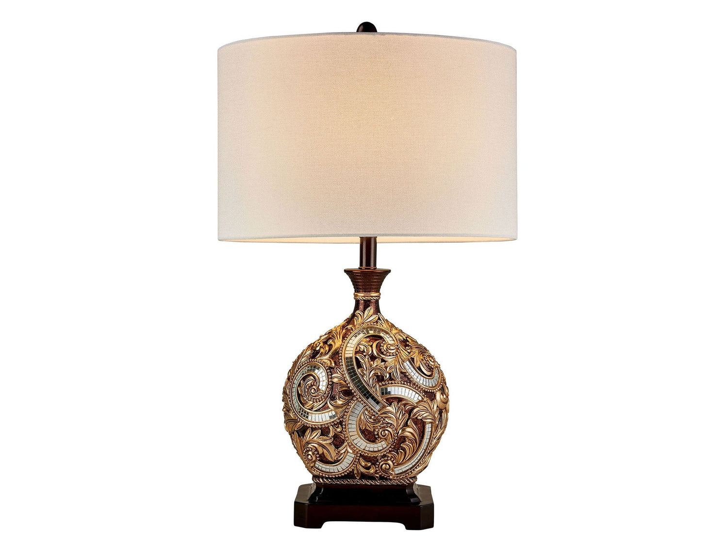 For traditional design lovers, this intricate, gold-colored lamp is certainly a pleaser. Mirror tile accents in organic shapes provide striking visual contrast.