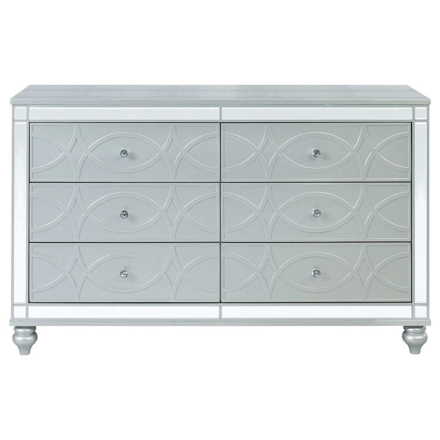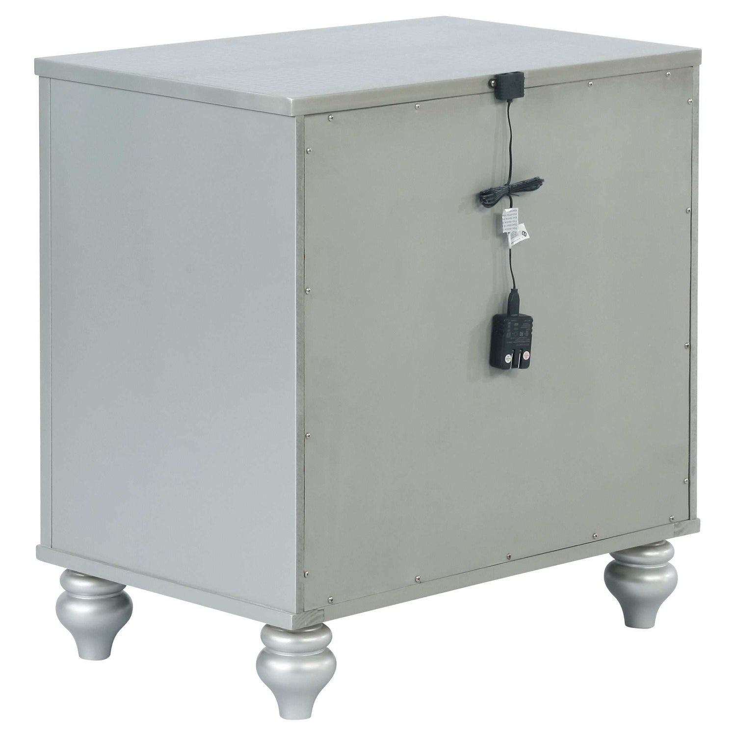 This contemporary 4-piece bedroom set featuring a bed, Nightstand: , dresser, and mirror imparts a glamorous look and feel to any modern home. Each piece of this exclusive Coaster design comes in a shimmering silver metallic finish that enlivens any space. The imposing bed headboard is upholstered with metallic leatherette that's fully tufted with crystal buttons. The headboard and mirror include white LED touch lighting for a vibrant ambiance, while the Nightstand: features USB ports. The drawers on each case good are crafted with fret work detail on the front panels and crystal-like pulls, with top drawers lined with black felt to protect your valuables.