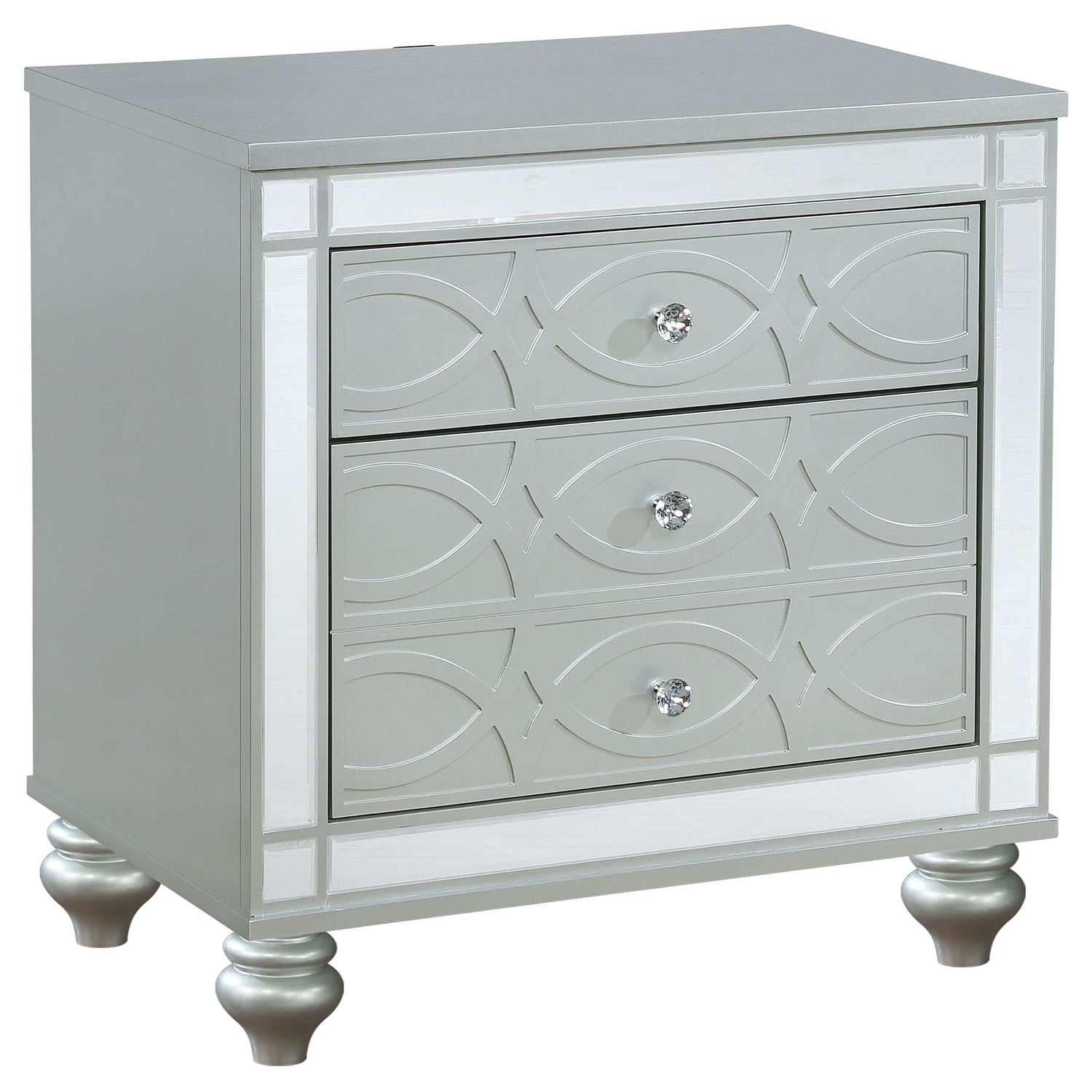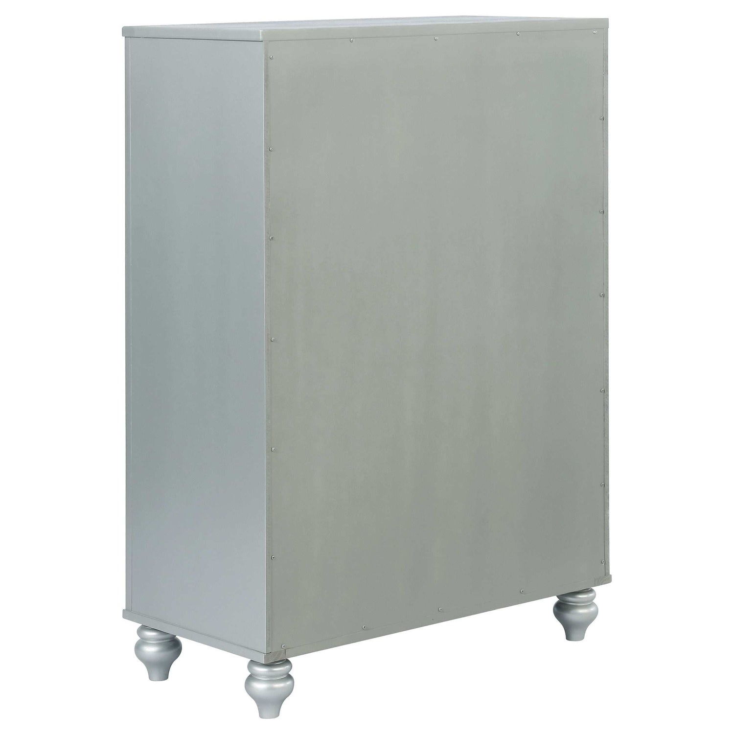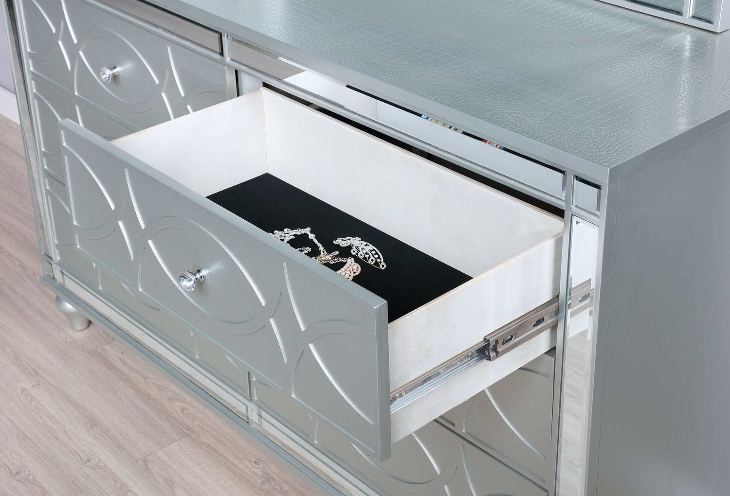 Transform a bedroom into a stylish sanctuary.This stunning, five-piece bedroom set is a truly exquisite choice with its elegant fretwork and dramatic decorative accents.The metallic leatherette headboard flaunts crystal button tufting for a touch of bling.The headboard and mirror are traced with blue LED light for soft ambiance.The Nightstand: , chest, and dresser feature decorative drawer fronts and provide plenty of storage space for a neat and organized personal space.