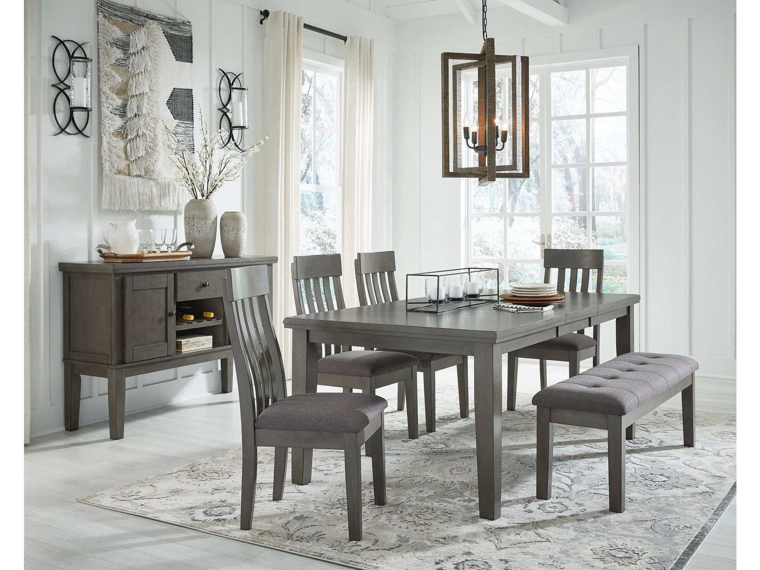Cool and on-trend. This dining package sports a two-tone gray look for a contemporary-yet-casual feel. The rectangular table features a thick sturdy top with a self-storing butterfly leaf, making it a breeze to expand your table space. Comfortably cushioned, the side chair features a padded seat, while its contoured comb-back design adds a dash of geometric flair. Gray textural fabric pairs seamlessly with the antiqued gray finish of the table.