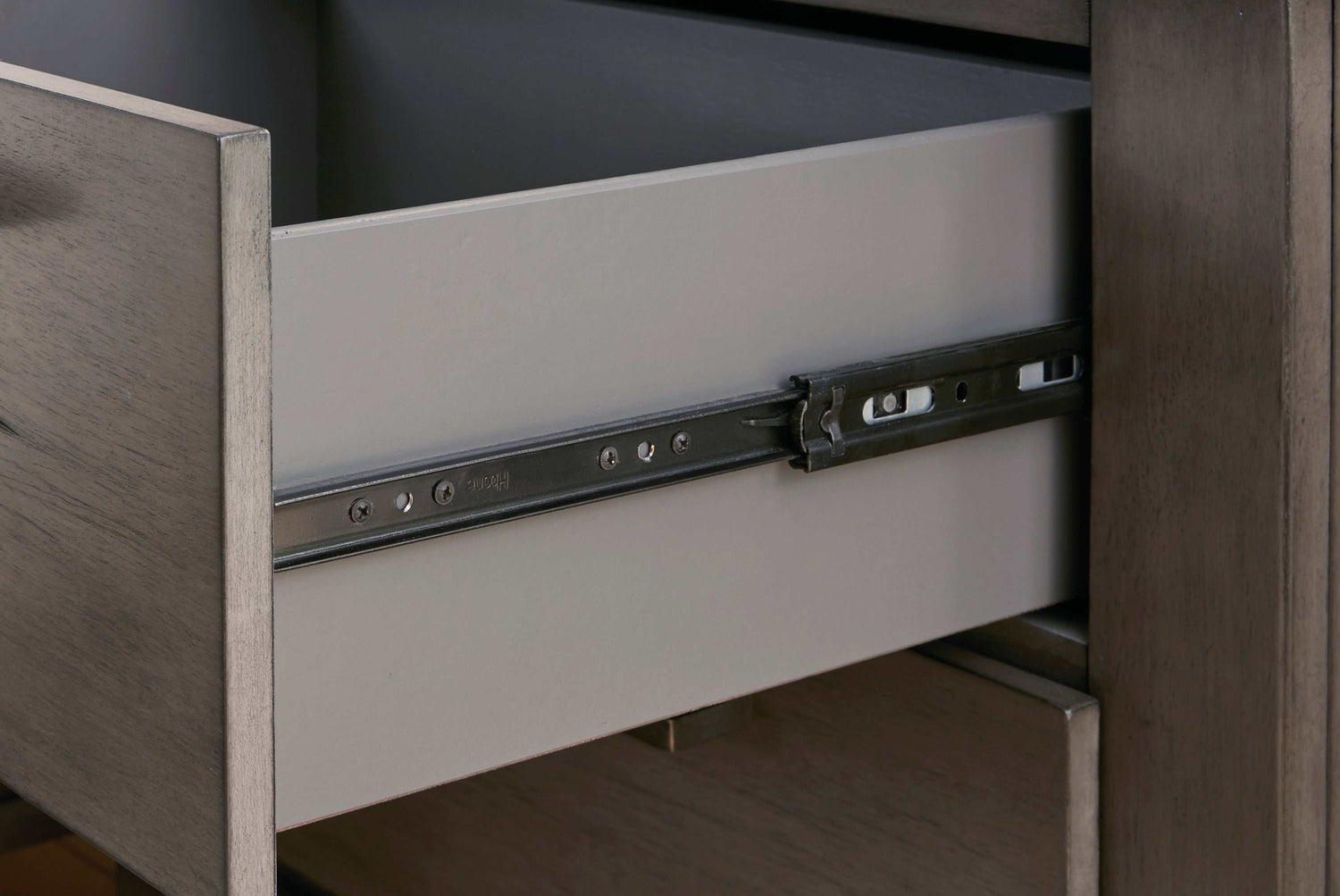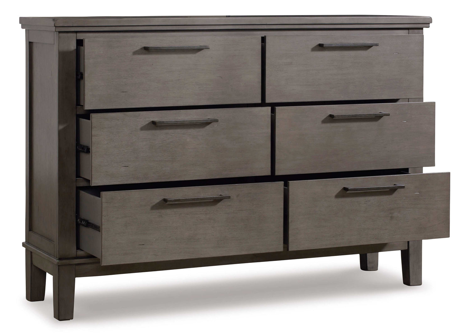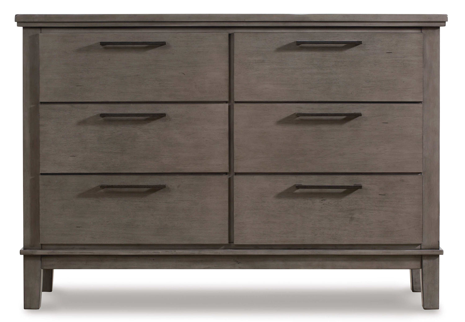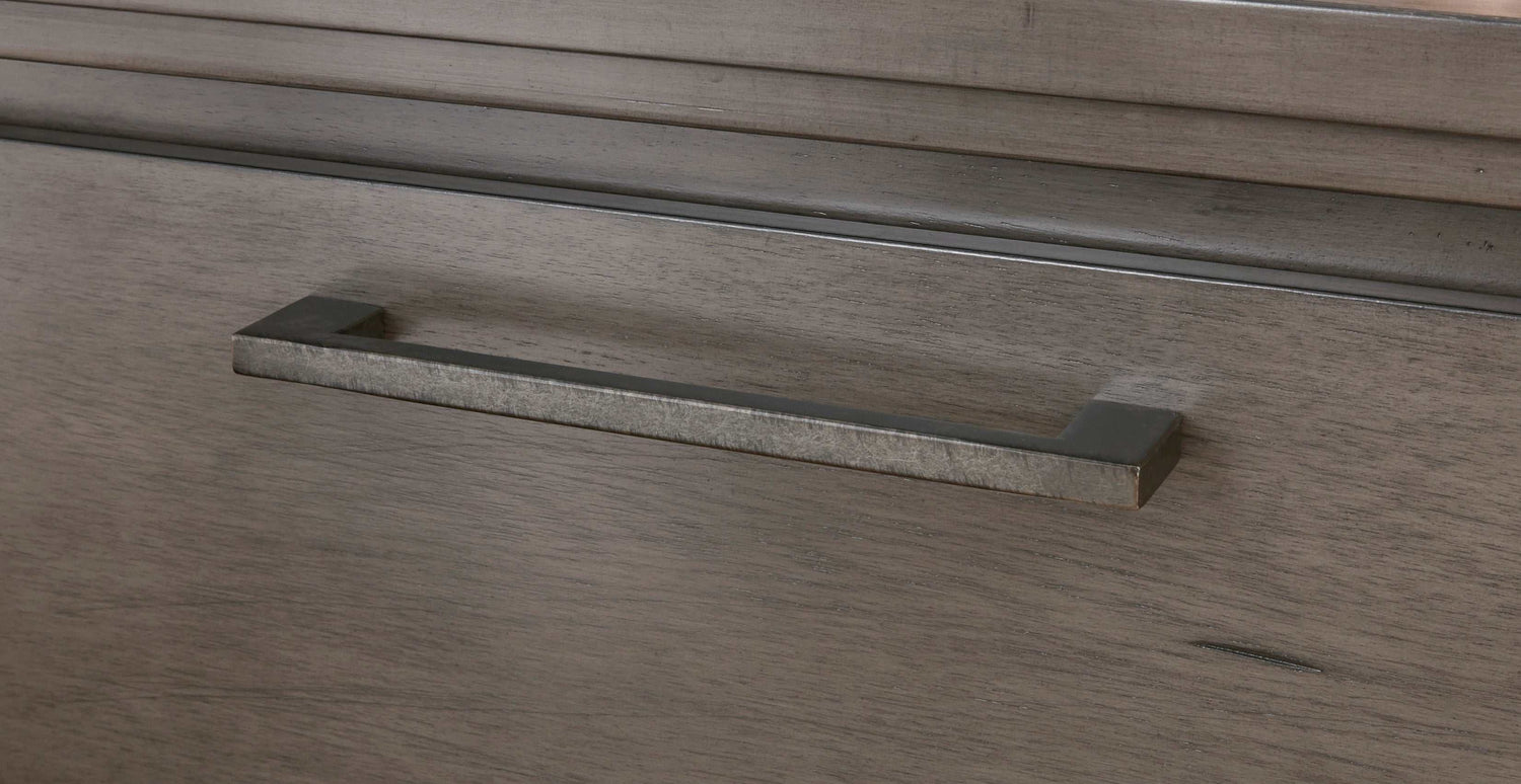Loaded with structured style and a touch of edgy flair, this dresser with mirror suits those with casually cool attitudes. Dressed in an antiqued gray, its thick top and tapered feet keep the simple design fresh. Six smooth-gliding drawers sport metal bar pulls for an instantly classic storage solution.