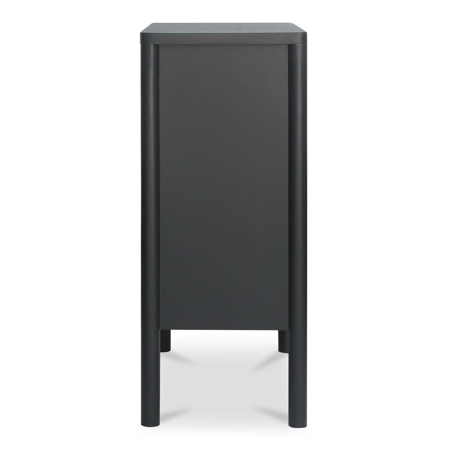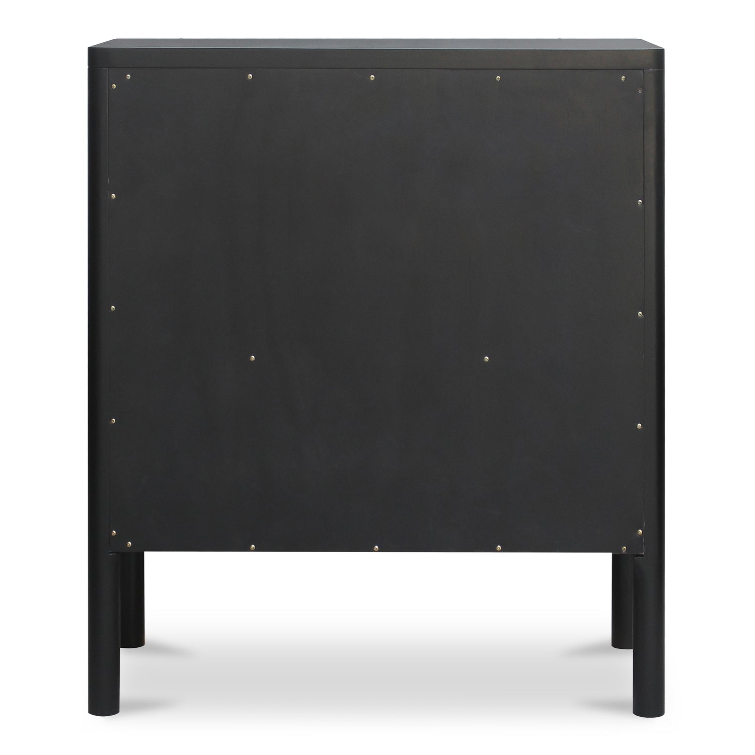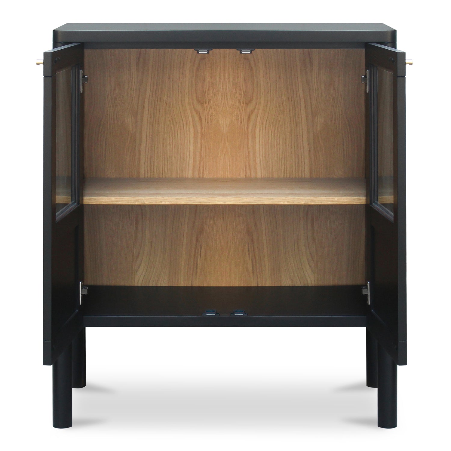 - Door front panels are a balance between transparent and concealed storage. Dowel legs and simple bronze hardware add softness