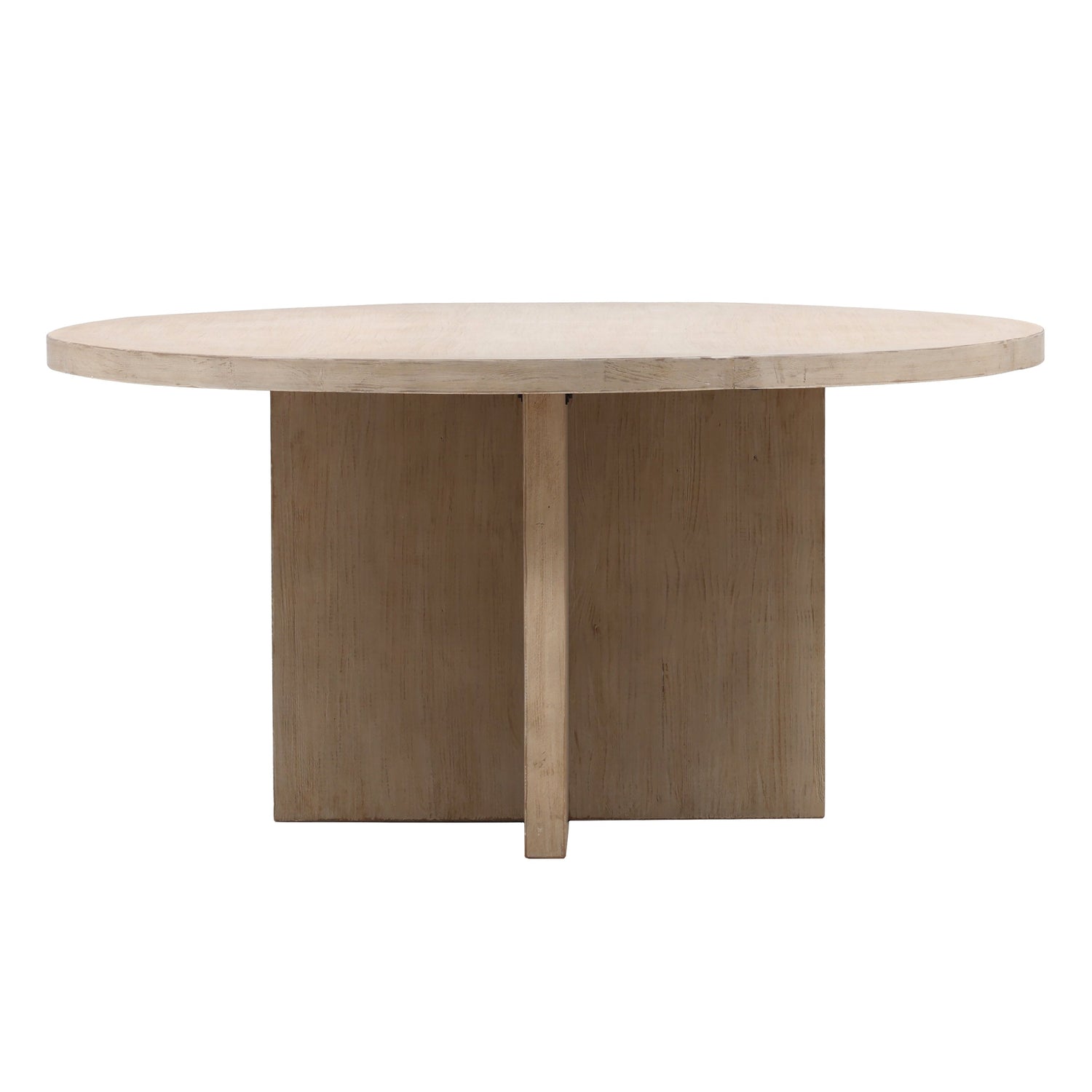 Modern organic design crafted from reclaimed pine wood. Featuring a round top and X shaped base, this antique white wash dining table is the perfect way to add a touch of freshness to your dining space. Its natural finish allows the subtle beauty of the wood grain to remain visible. A truly versatile piece that will elevate your space.