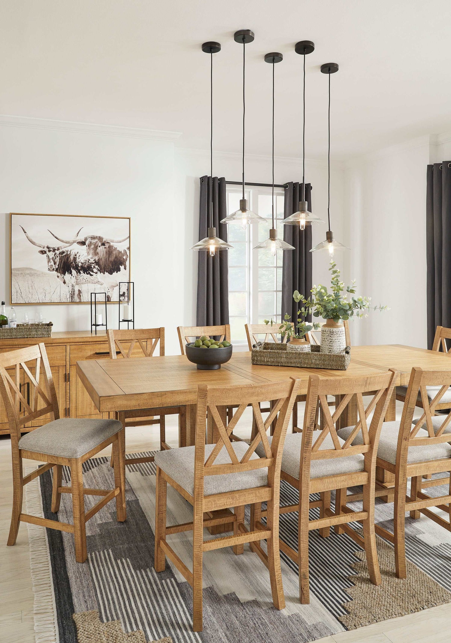 This counter-height dining package is a favorite for casual rustic interiors. Offering plenty of seating space, it’s your answer for everyday living and impromptu guests. And the distressed pine finish, double trestle base, and two extension leaves? Deliciously charming and versatile.