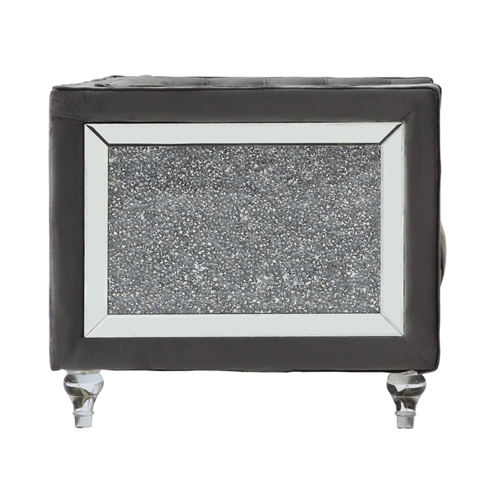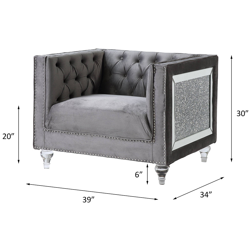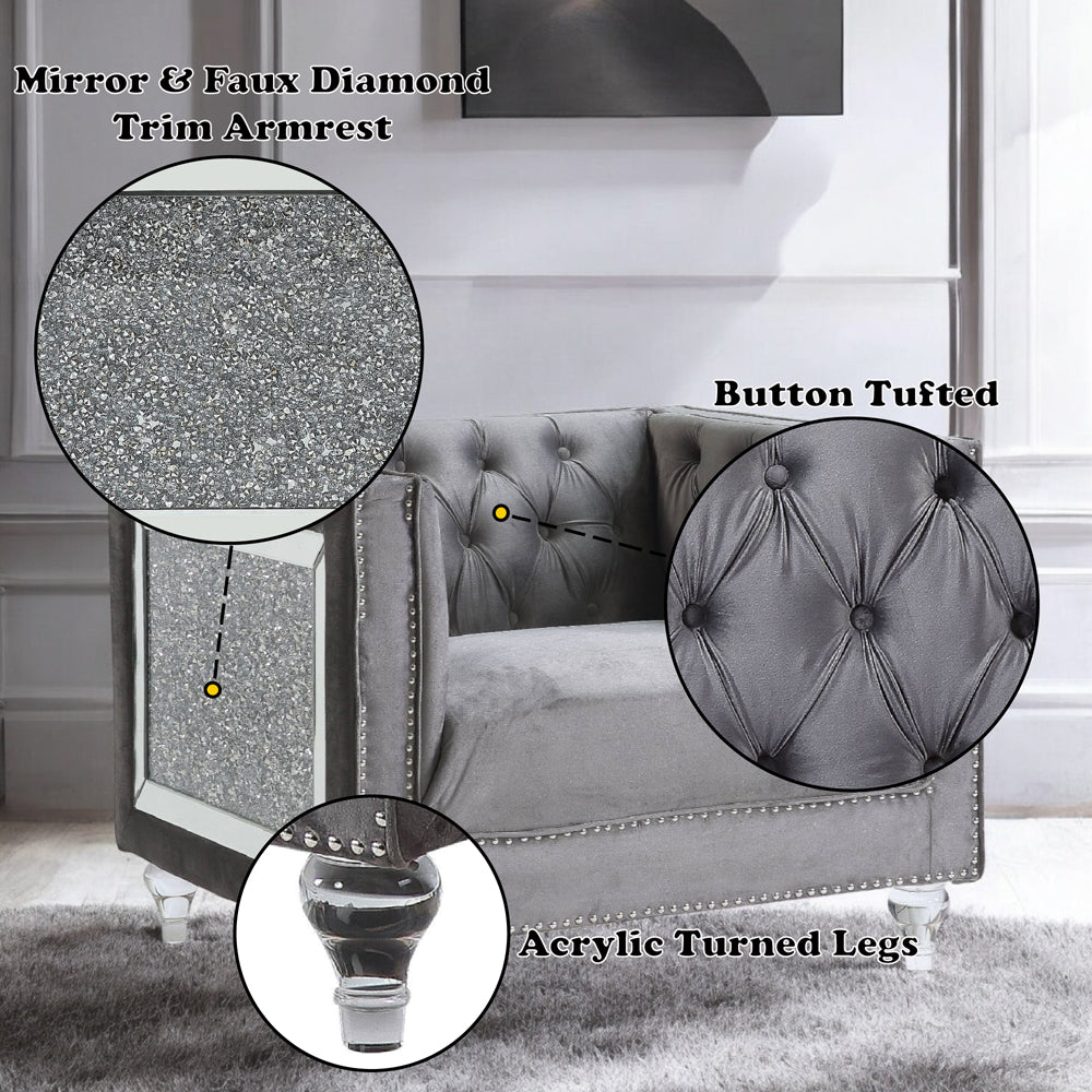 Impressive and bold, the Heiberoll living room collection is sure to impress your guests. The set includes mirrored side trim with faux diamonds to add a glimmering touch. The whimsical acrylic turned legs give off the illusion that the pieces are floating. The collection is upholstered in a plush velvet that feels silken to the touch. Ultra-comfortable seats and a sturdy wooden inner frame make this piece a joy to lounge on. Classic nailhead trim and button tufting finish off this glamorous set. Available in two colors pink and gray.