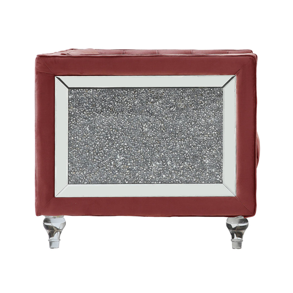 Impressive and bold, the Heiberoll living room collection is sure to impress your guests. The set includes mirrored side trim with faux diamonds to add a glimmering touch. The whimsical acrylic turned legs give off the illusion that the pieces are floating. The collection is upholstered in a plush velvet that feels silken to the touch. Ultra-comfortable seats and a sturdy wooden inner frame make this piece a joy to lounge on. Classic nailhead trim and button tufting finish off this glamorous set. Available in two colors pink and gray.