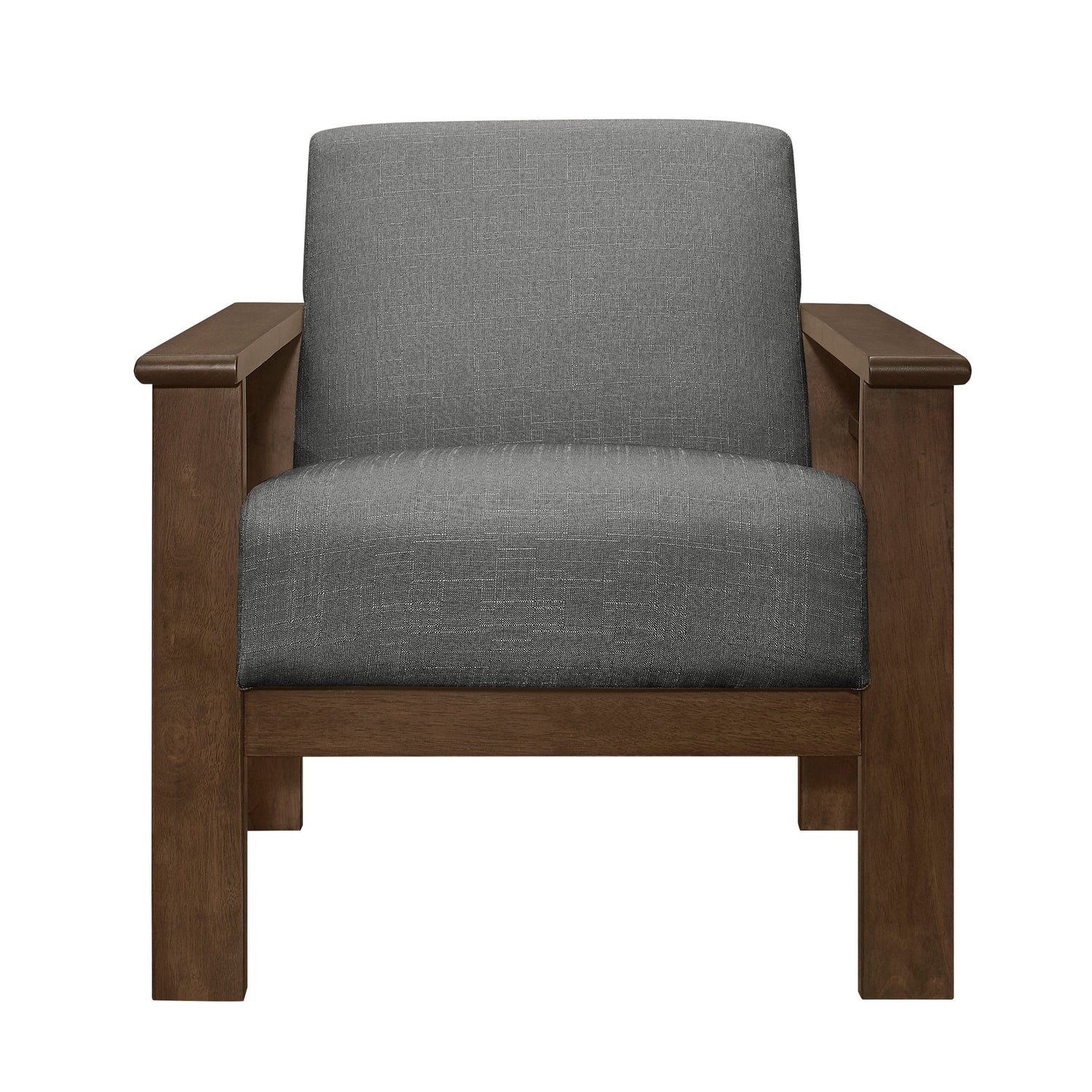 Providing accent to the transitional surroundings of your home is the Helena Collection. Styled with a nod to the Arts & Crafts era, the chair’s solid wood construction features a walnut finish, vertical slat accent on the arms, as well as clever and convenient storage space located between the seat and arm profile. The padded seat and back of the chair is covered with gray textured fabric upholstery.