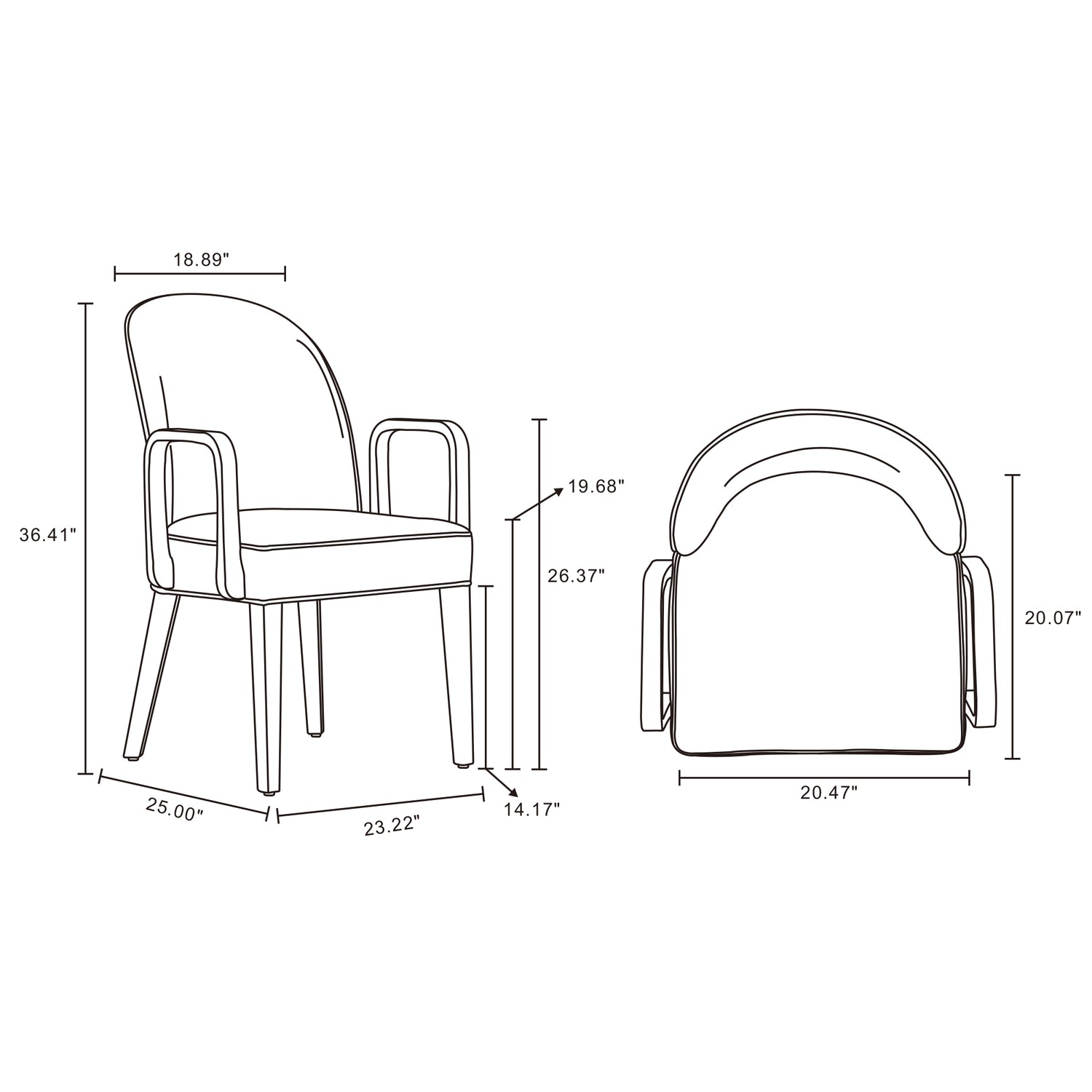 - Dining Arm Chair Dimensions Measure: 23.22 in. Length, 36.41 in. Height, 25 in. Depth.
