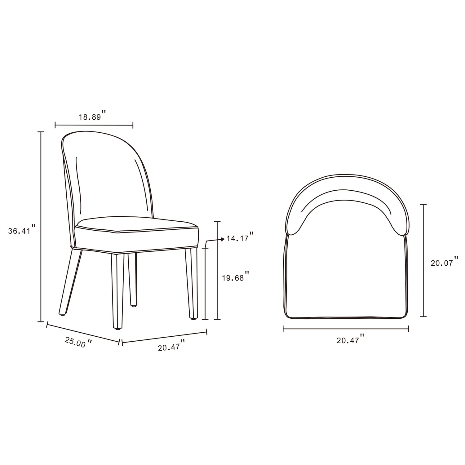 - Dining Arm Chair Dimensions Measure: 23.22 in. Length, 36.41 in. Height, 25 in. Depth. Dining Chair - Set of 2 Dimensions Measure: 20.47 in. Length, 36.41 in. Height, 25 in. Depth.