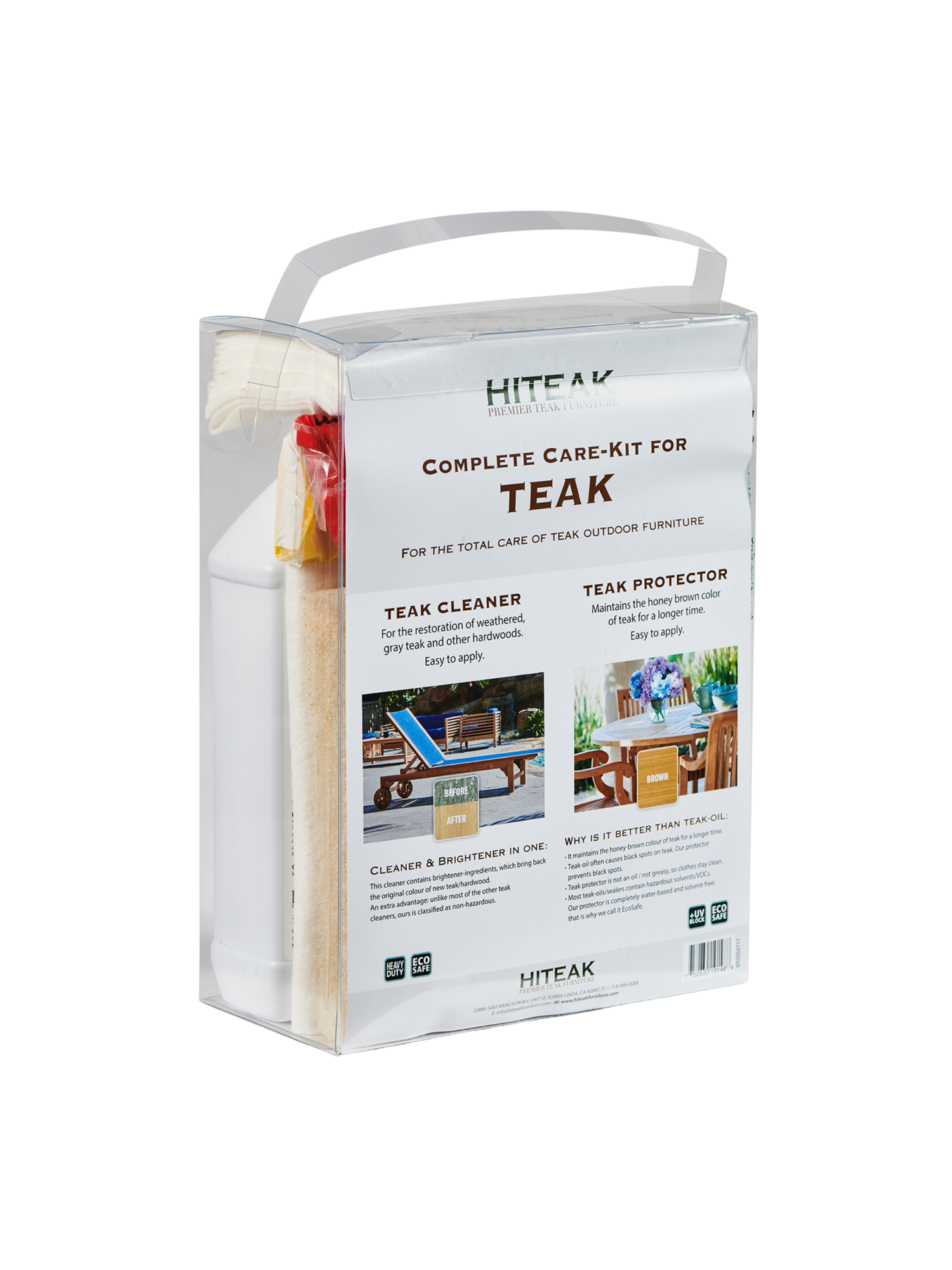 - Includes a Cleaner, a Protector, and application tools for the total care of teak outdoor furniture.