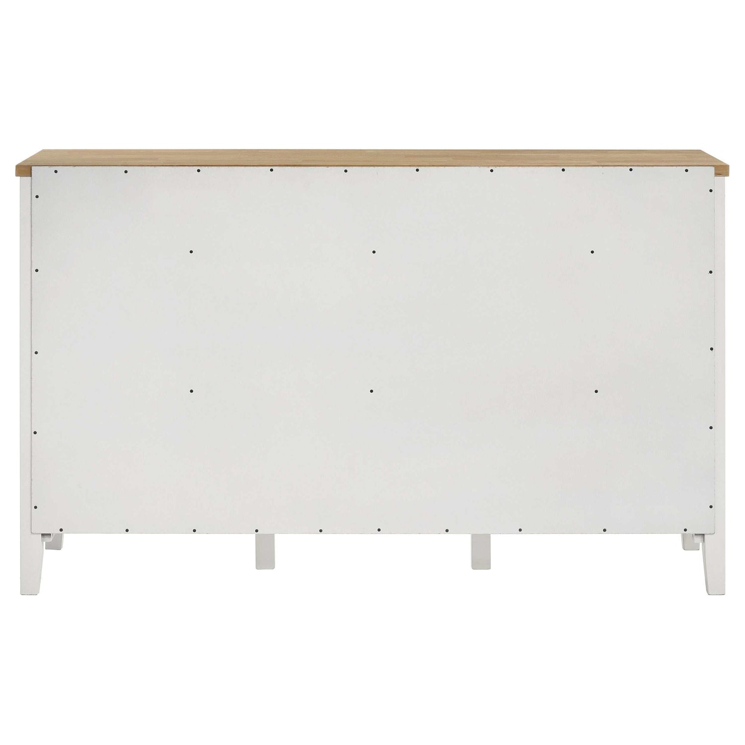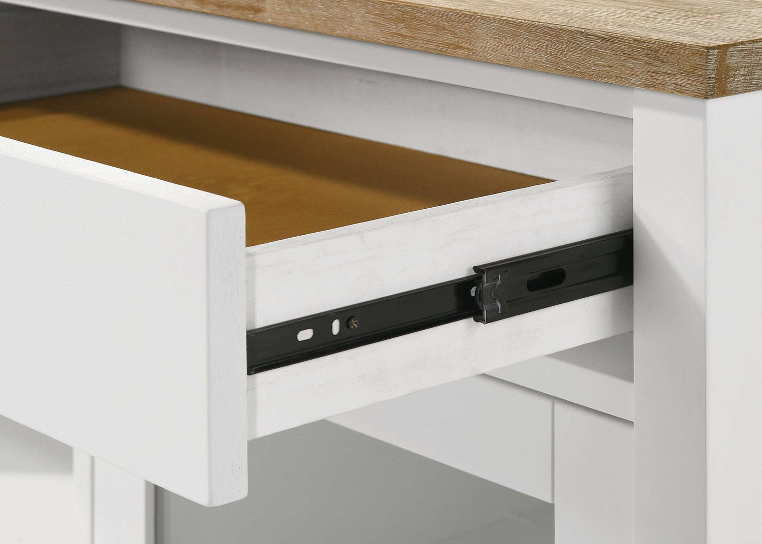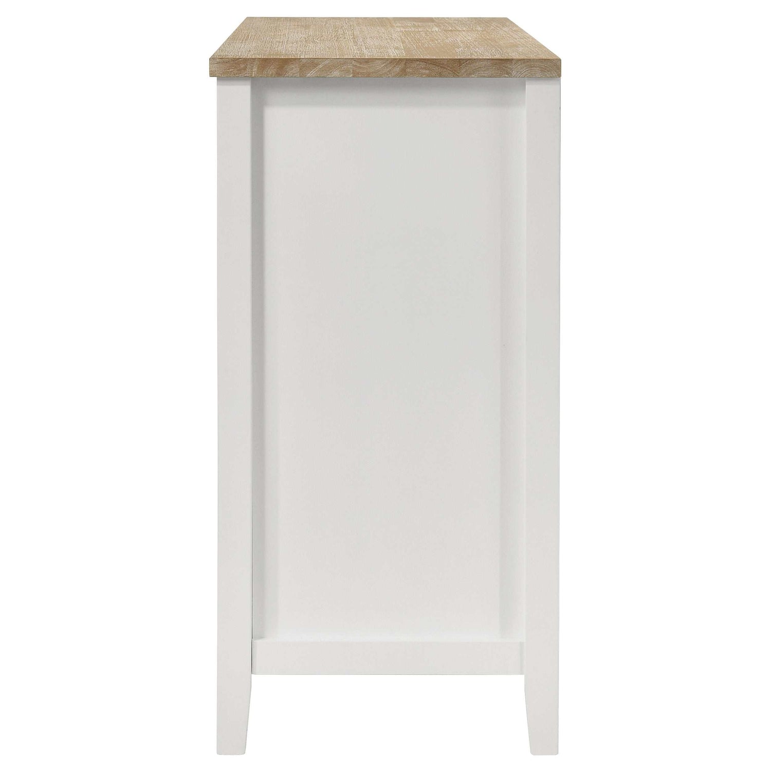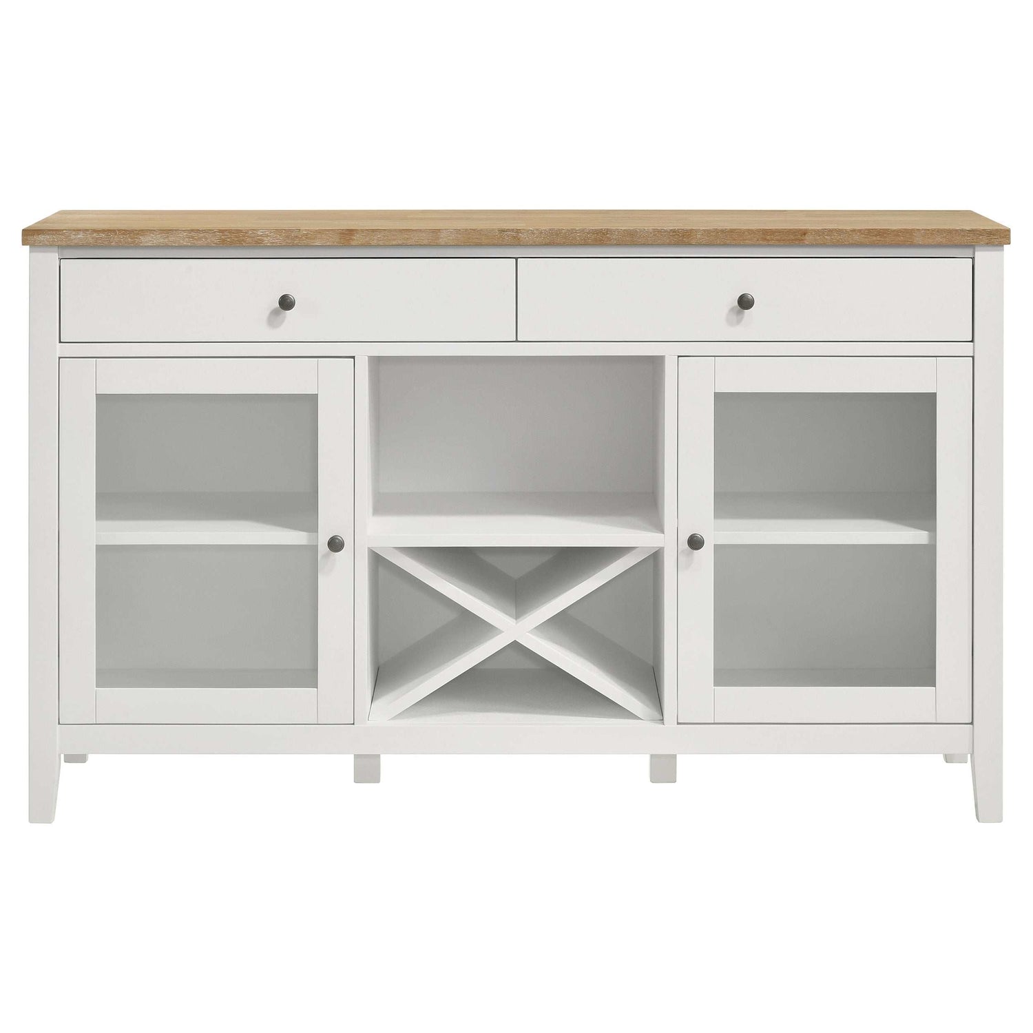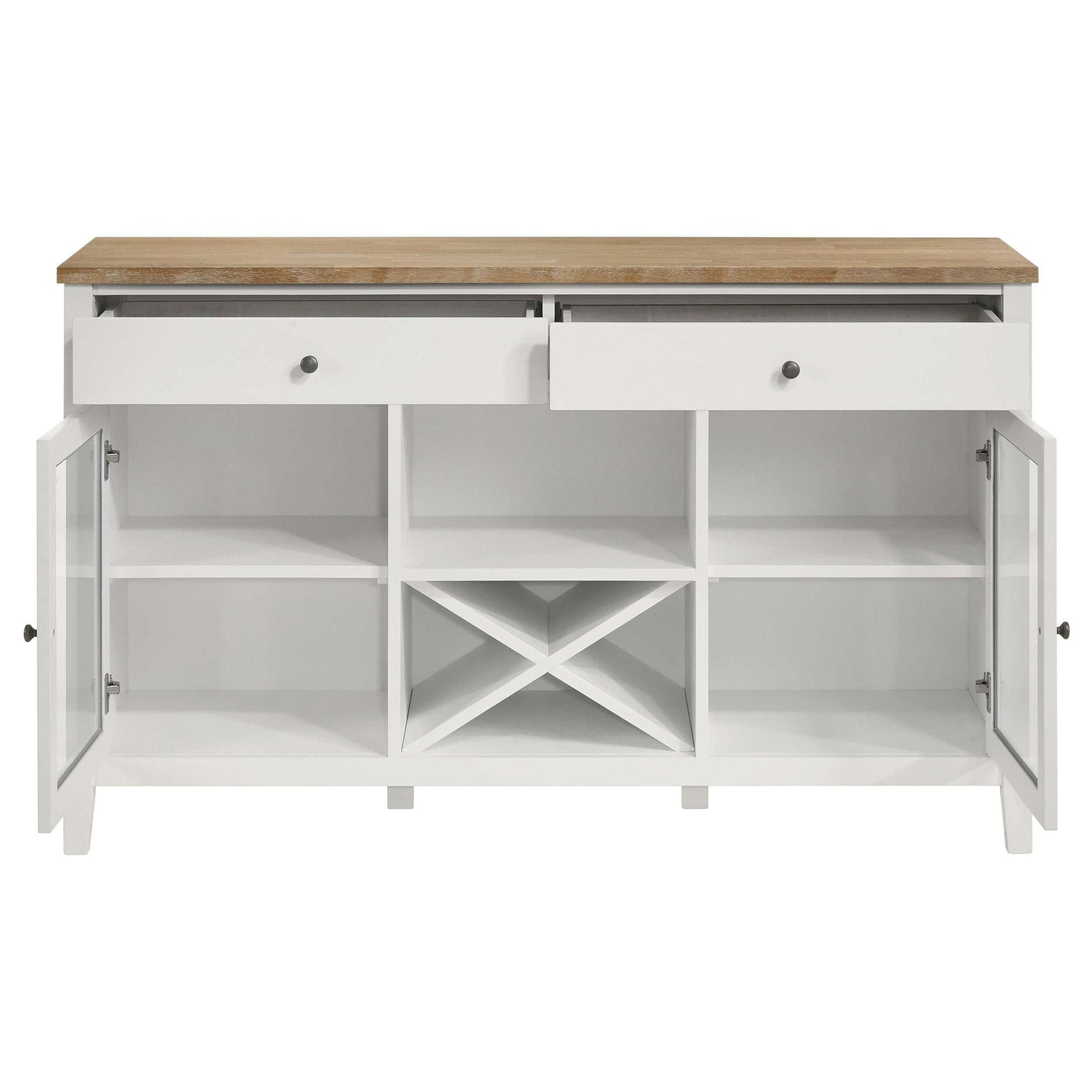 Wire brushing adds the perfect hint of rustic distressing to the tabletop featured on a modern farmhouse sideboard. It's tow=tone look adds charm in a kitchen or dining room, with a natural wood top and crisp white base that adds contrast while maintaining a neutral color palette. Two drawers are ideal for utensils and delicate items with felt lining in a light brown hue. Two side cabinets add glass doors for showing off cookbooks, crockery or glassware. In the center, one open shelf and an X-cross bottle rack add a perfect spot for favorite bottles of wine and stylish decor that brings a personal touch.
