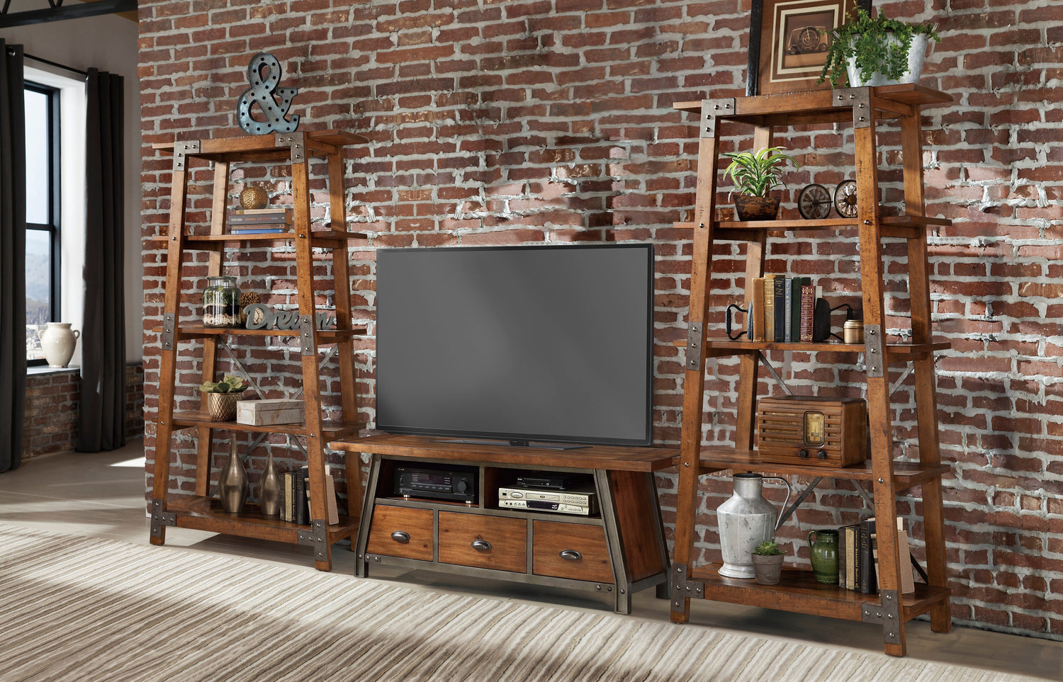 Heavily influenced by industrial design, the Holverson Collection will lend a unique look to your personal space. Gunmetal finished wood framing provides sturdy structure and profile to this home entertainment offering. Faux rivets provide additional detail to the metal bracketing that is prominently on display. A rustic brown milk crate finish is utilized to highlight the acacia veneer. Open media display and drawer storage further the functionality of the Holverson Collection.