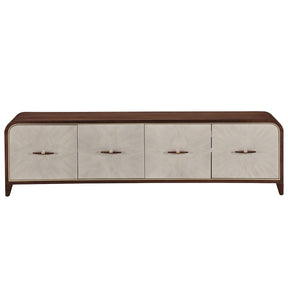 Elevate your entertainment space with the Houston Media Cabinet, a sophisticated blend of modern design and functional elegance. Its sleek silhouette is finished in warm walnut, offering a timeless foundation for any living room or media setup. The doors feature a striking gray hue with a subtle starburst pattern and a softly textured surface, beautifully contrasted by a gold trim. Designed for convenience, the spacious interior provides ample storage, while thoughtful details like cable management and adjustable shelving ensure seamless organization.